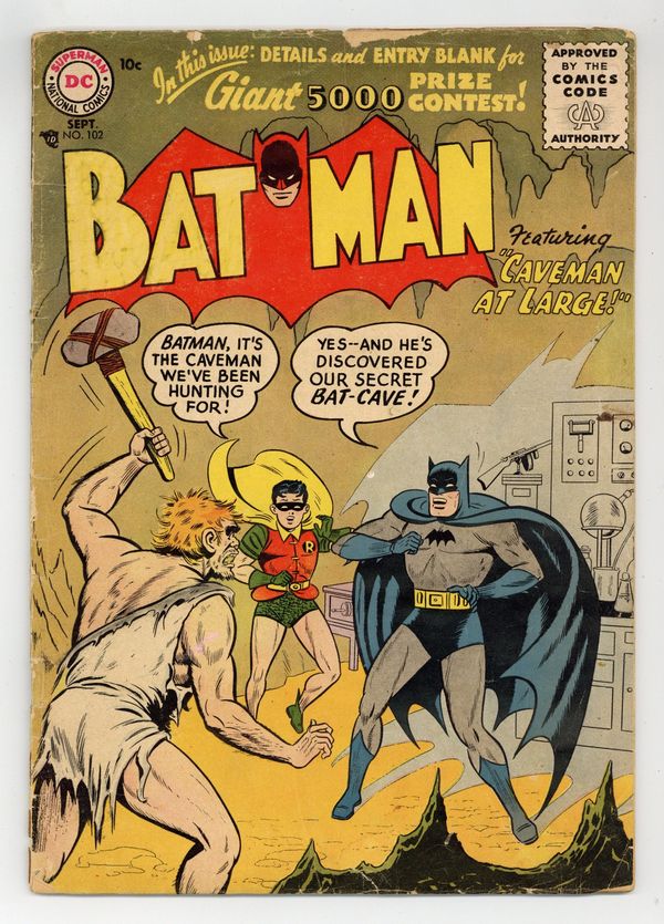 Cover by Sheldon Moldoff. "The House of Batman," pencils by Sheldon Moldoff, inks by Charles Paris; A wealthy man leaves money to Gotham to build a downtown HQ for Batman, but the Caped Crusader is surprised when the city builds as House of Batman for him. "The Batman from Babylon," script by Bill Finger, pencils by Dick Sprang, inks by Charles Paris; When Brand Bartor is arrested for dressing in a Batman costume, the crook turns the tables on the Caped Crusader by implying Batman should be arrested for impersonating a Babylonian Batman! "Scotland Yard's Search for a Stone" text story. Half-page Pretzels story by Phil Berube. "The Caveman at Large," script by Bill Finger, pencils by Sheldon Moldoff (as Bob Kane), inks by Charles Paris; A freak accident causes a great character actor to assume the character's persona he is dressed up to portray: a caveman! One-page Casey the Cop story by Henry Boltinoff. 36 Pages, Full Color. Cover price $0.10. Grade: GD- 1.8 explanation of grade Condition: Used (collectible)