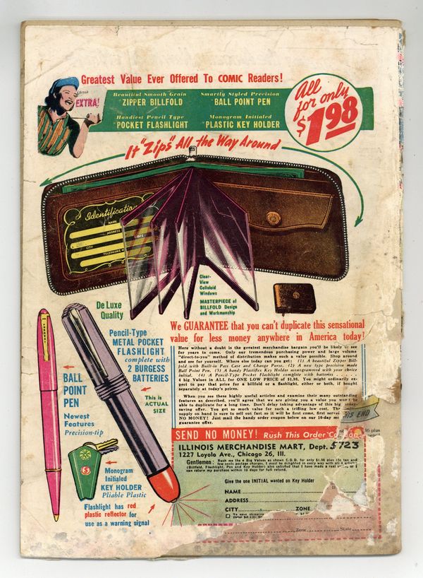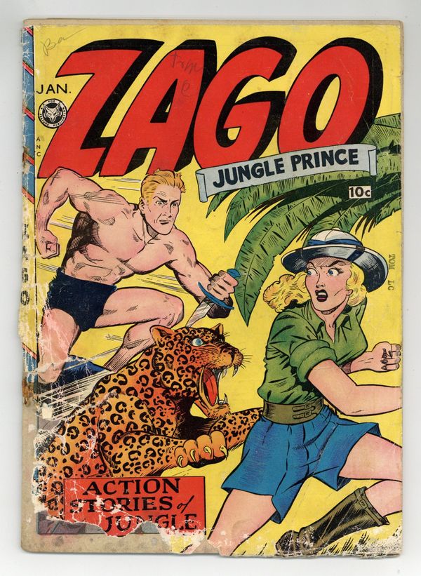 In order of appearance: "Zago Jungle Prince, Circle of Cruelty!"; "Insect Bombers" reprinted from Eagle (1945 Rural Home) #2; "Tales From the Old Scout"; "Zago Jungle Prince, The Silver Spear of Death!"; "The Eagle Scouts of Rosedale, U.S.A featuring Billy, Ernie, and Pee-Wee, Four of a Kind!" reprinted from Eagle (1945 Rural Home) #2; and "Out Where the West Begins!". "The Winds of Jungle Doom" text story. Indicia states "ZAGO". 36 pages. Full color. Cover price $0.10. Grade: PR 0.5 explanation of grade Condition: Used (collectible)