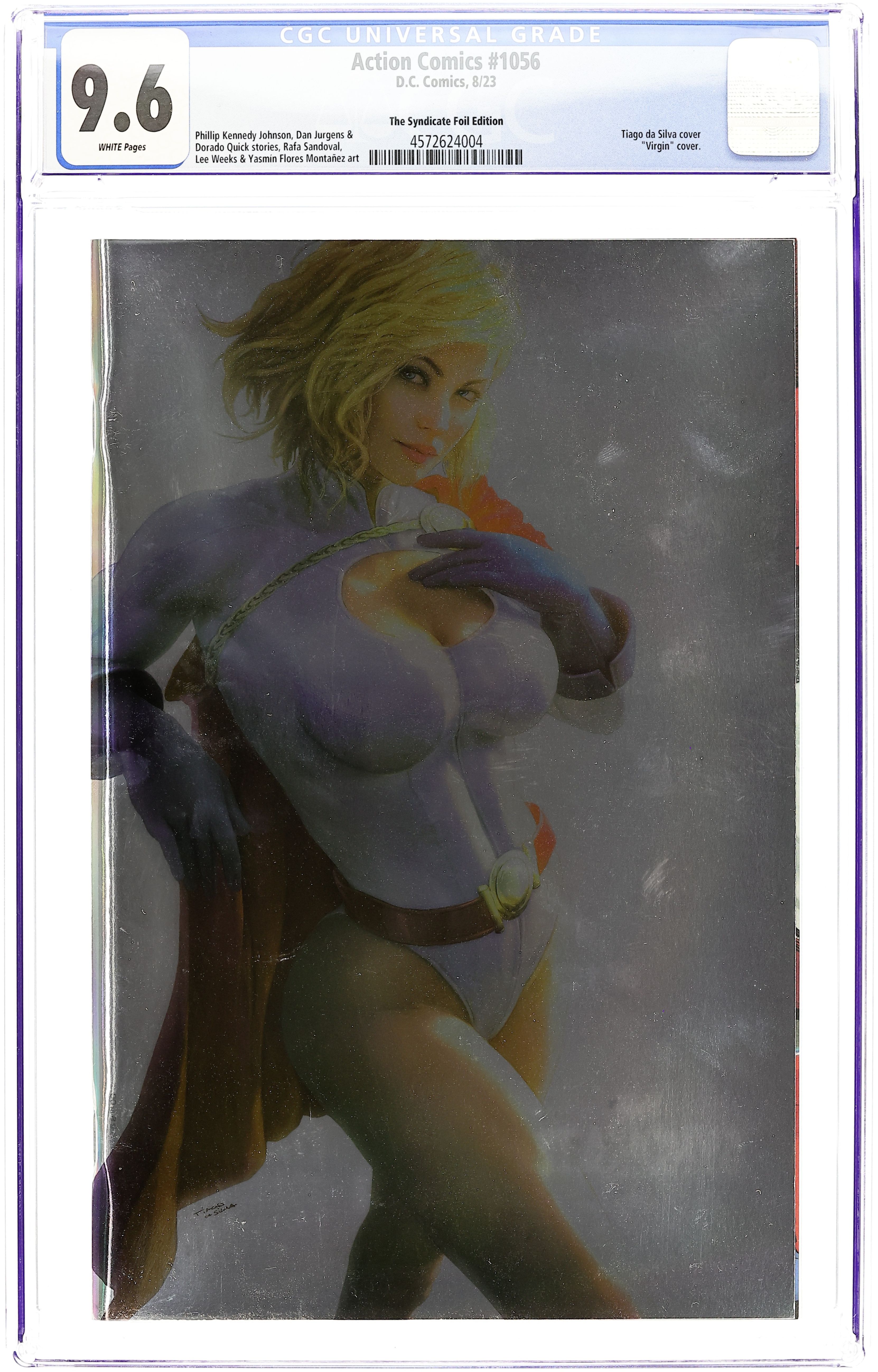 The Syndicate (The 616 Comics, Unknown Comics, Comic Traders, and Fandom Comic Shop) exclusive Foil Edition Virgin cover by Tiago Da Silva. Written by Phillip Kennedy Johnson, Dan Jurgens, and Dorado Quick. Art by Rafa Sandoval, Lee Weeks, and Yasmin Flores Montanez. A shocking new character makes their debut as the thrill-packed Speeding Bullets concludes! Superman and Metallo must reluctantly join forces to stop the Cyborg Superman. With Tracy Corben's life (or at least her humanity) hanging in the balance, the Super-Family fights to keep Metropolis standing. Meanwhile, Lois and the staff of the Daily Planet set out to uncover the mysterious leader--and shocking origin--of Blue Earth! 48 pages, full color. Rated T+ Grade: CGC 9.6 explanation of grade Condition: Used (collectible)