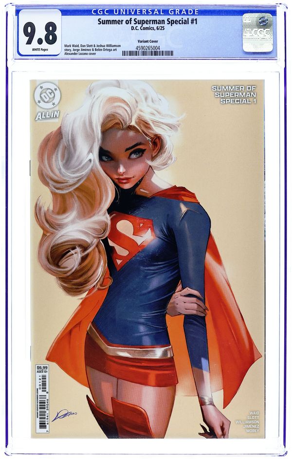 Written by Dan Slott, Joshua Williamson, Mark Waid. Art by Jorge Jimenez. Cover by Alexander Lozano. THIS IS IT! SPRING INTO THE SUMMER OF SUPERMAN! The Man of Steel and his universe of friends, family, allies, and rogues is in for some big changes, and it all starts in the Summer of Superman Special! Brought to you by Superman series architects Joshua Williamson (Superman), Mark Waid (Superman: Action Comics), and (making his grand entrance to the world of tomorrow) Dan Slott, this special oversize issue will set the stage for all the major events exploding throughout the Superman titles! When John Henry Irons and Lana Lang take their vows, everyone turns up for the big day--but trouble is brewing on the horizon, as threats from the past, present, and future kick off major new conflicts for the Superman Family. Brought to stunning life by the incomparable art of Jorge Jimenez (Batman, Super Sons), the Summer of Superman Special is the ground floor to the most exciting action imaginable in 2025! 48 pages, full color. Rated T+ Cover price $6.99. Grade: CGC 9.8 explanation of grade Condition: Used (collectible) unless item is a new release