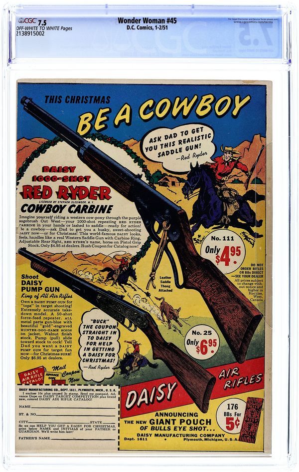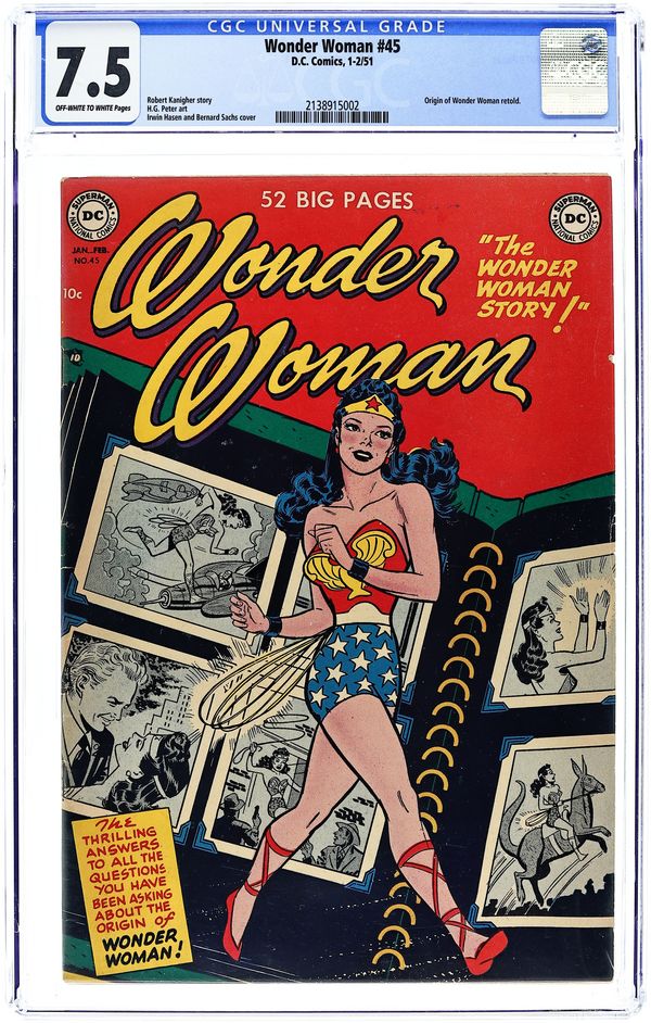 Cover pencils by Irwin Hasen, inks by Bernard Sachs. "The Wonder Woman Story," script by Robert Kanigher, art by Harry G. Peter; A female reporter gets the scoop that will win her a job at the Daily Globe over her male rival - the secret story of Wonder Woman and the Amazons. "Wonder Woman Story Part 2: Act of Treachery," script by Robert Kanigher, art by Harry G. Peter; As Mary Ellen observes the early days of the Amazons and Wonder Woman's origin, her male rival tracks her to Paradise Island, where his reckless flying threatens the Amazons. Wonder Women of History: two-page Helene Kottauer bio by Julius Schwartz, pencils by Robert Oksner, inks by John Giunta. "The Amazon and the Leprechaun," script by Robert Kanigher, art by Harry G. Peter; A leprechaun wins a scholarship to Holliday College, and Wonder Woman, as acting dean, must endure his pranks while protecting him from gangsters attempting to steal his pot of gold. "Gentlemen Be Seated" text story. "Wonder Woman - Western Whirlwind," script by Robert Kanigher, art by Harry G. Peter; Wonder Woman and the Holliday girls travel to the "New West" for a wedding that may be cancelled when the groom's father is suspected of resuming his career as a stagecoach robber. Superboy stars in a one-page public service announcement, "How to Bring Christmas Cheer." 52 Pages, Full Color. Cover price $0.10. Grade: CGC 7.5 explanation of grade Condition: Used (collectible)