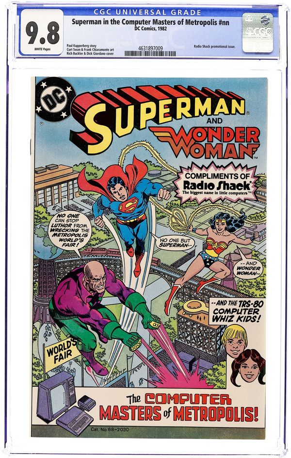 The Computer Masters of Metropolis - Written by Paul Kupperberg. Art by Curt Swan and Frank Chiaramonte. Cover by Rich Buckler and Dick Giordano. Superman and Wonder Woman need the help of Alec and Shanna, with their TRS computers, to stop Lex Luthor from destroying the Metropolis World's Fair. Characters: Superman [Clark Kent]; Wonder Woman [Diana Prince]; Lex Luthor (villain); Alec; Shanna; Ms. Wilson; Mr. Murphy; William Shockley (Nobel winning scientist, cameo); Walter Brattain (Nobel winning scientist, cameo); John Bardeen (Nobel winning scientist, cameo); Cindy. 32 pages, full color. Grade: CGC 9.8 explanation of grade Condition: Used (collectible)