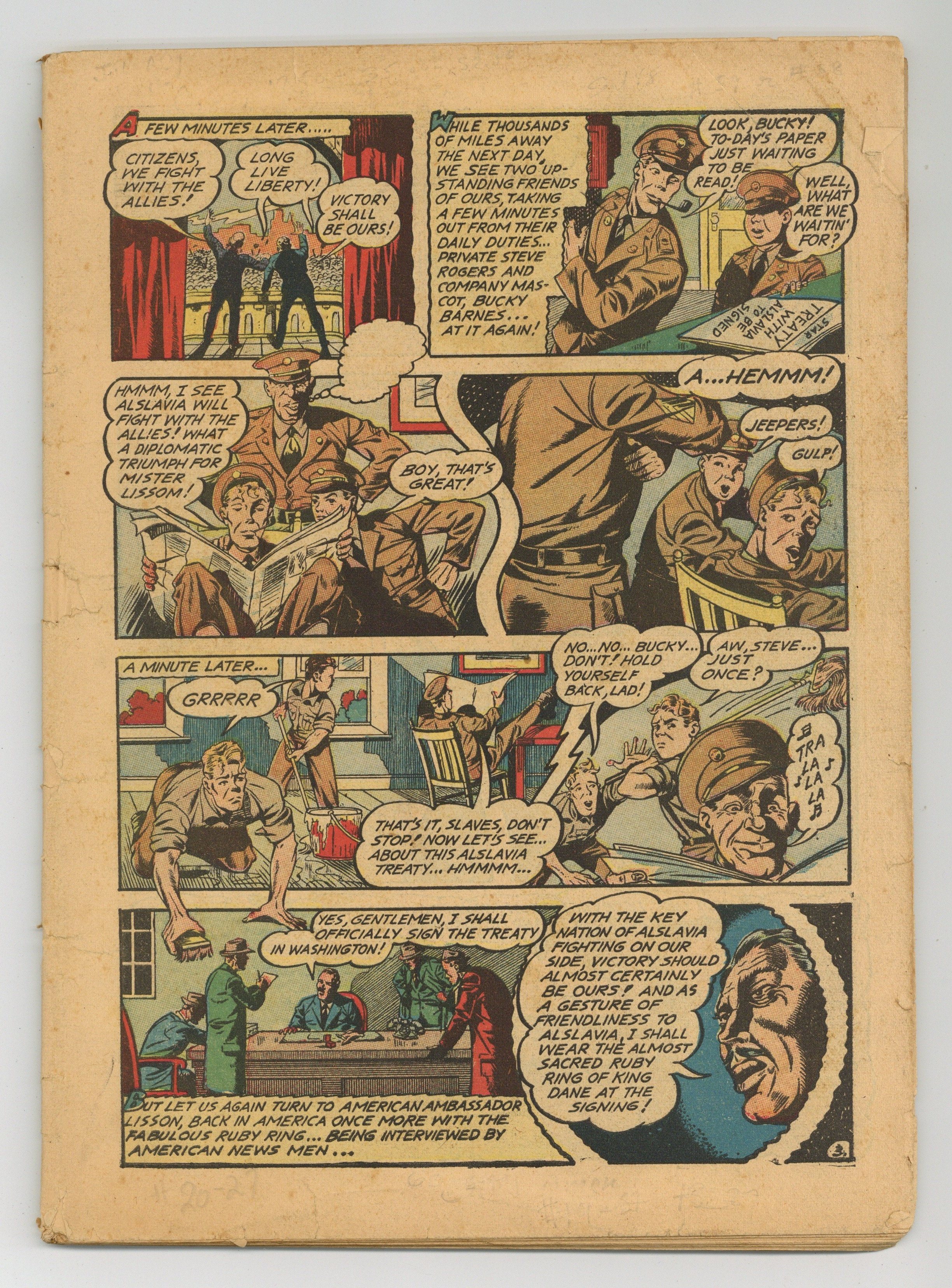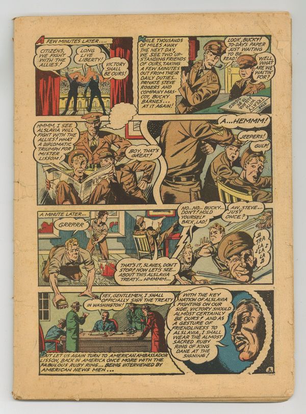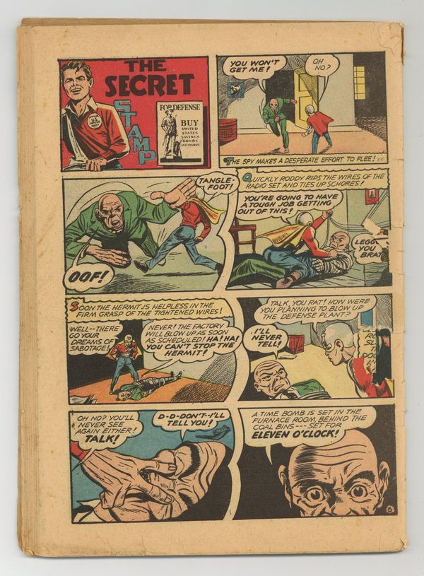 Cover by Syd Shores. "The Creeper and the 3 Rubies of Doom!", pencils by Al Avison (as Syd Shores), inks by Syd Shores (as Vince Alascia); One of Hitler's agents, the Creeper, steals a tri-rubied treaty ring in hopes of disrupting the signing of a treaty that pledges the last neutral European country to fight alongside the Allies, because he thinks that, when the U.S. ambassador Lissom signs the treaty without wearing the ring he was gifted by the ruler, the country will perceive a slight and choose to throw in with the Axis instead. "The Cobra Strikes"; The Torch and Toro spot the kidnapping of the South American Ambassador, but they are gassed by the perpetrators. "Satan and the Sorcerer's Secret!"; Balthar comes to Bald Mountain in order to study Egyptian writings on how the souls of the dead can be brought back to life, when Satan appears and claims the sorcerer's soul until he can redeem it. "Catch That Firebug!" text story. "The Sinister Spies," script and art by Guy Blythe; Dippy is going to sign a treaty with the United States, but first decides to play a game of golf, not knowing two spies are out to kill him before the treaty can be signed. "The Case of the Silent Hermit," script by Stan Lee, art by Bob Oksner; Roddy attempts to sell some war stamps to an old hermit, but is led to believe that the old man has little money to keep body and soul together. Roddy attempts to sell some war stamps to an old hermit, but is led to believe that the old man has little money to keep body and soul together. 68 pgs., full color. Cover price $0.10. Cover price $0.10. Grade: Coverless explanation of grade Condition: Used (collectible)