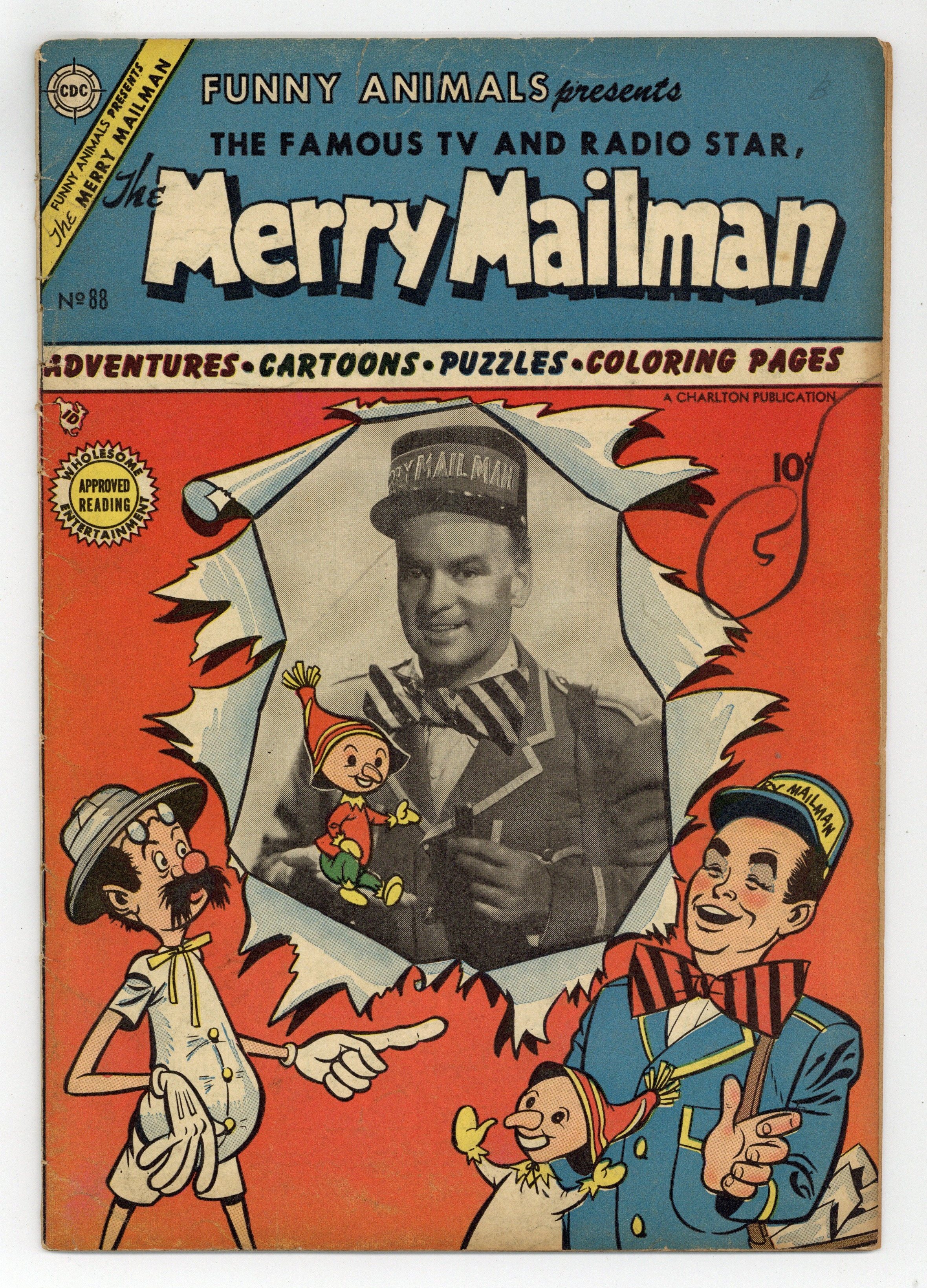 Cover by Al Fago. Stories and art by Al Fago and Fred Ottenheimer. Funny-animal comics from Charlton. With this Charlton issue, Funny Animals gets a new star, the comics incarnation of 1950s kids' TV personality The Merry Mailman. Merry Mailman and Wheezer are off for adventure when someone mails a treasure map to Long John Silver. Millie wonders why Hoppy doesn't want to kiss her when they're playing kissing games at her party. Plus the legends of folk hero Paul Bunyan. Li'l Buck; The Merry Mailman Goes to Treasure Island; Merry Mailman's Coloring Page; Hoppy: Missed Kiss; Fuzzy's Song Page; The Mouse Has the Last Laugh; The Merry Mailman: King for a Day!; Legends of Paul Bunyon; Color-Me-Up Puzzle Page; The Merry Mailman Goes to Africa; Wilbur the Waiter. 32 pages, Full Color. Cover price $0.10. Grade: GD 2.0 explanation of grade Condition: Used (collectible)