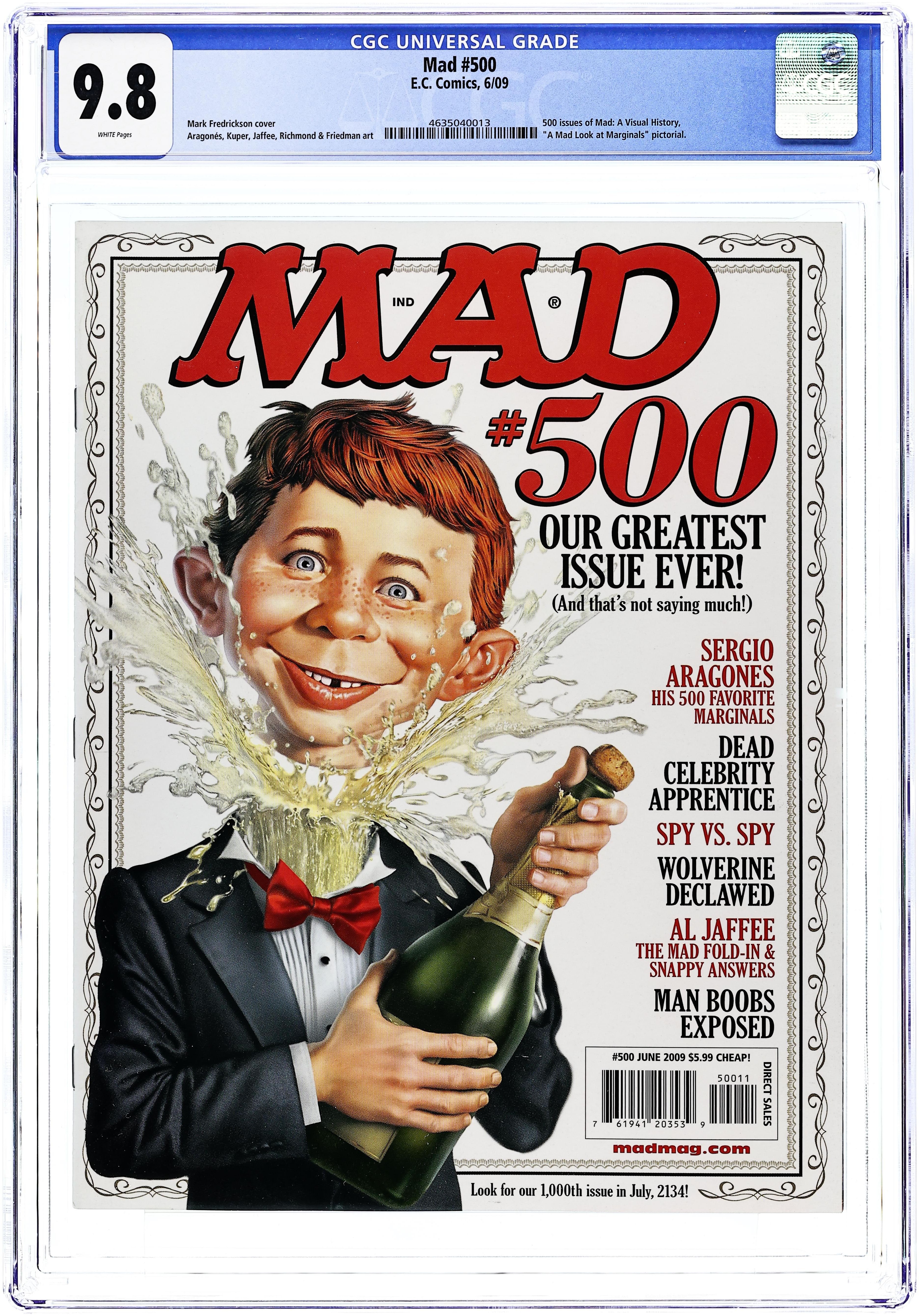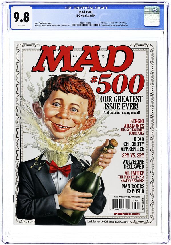 Cover art by Mark Fredrickson. "500 Issues of MAD: A Visual History," featuring work by Sergio Aragones, Dave Berg; Al Jaffee; Harvey Kurtzman, Don Martin, Joe Orlando, and many others; Collage of images from issues from earlier issues. "The Dead Celebrity Apprentice," script by Desmond Devlin, art by Tom Bunk; Parody of tv show "The Apprentice" with dead celebrities. "Spy vs. Spy vs. Spy" by Peter Kuper; The Gray Spy lures the other two into a burning building with a hologram of herself. "A MAD Look At Marginals," script and art by Sergio Aragones; Reprints of 500 of Sergio Aragones's favorite marginal gags from MAD Magazines. "Great Art Masterpieces And What They Would Be Saying Today"; Captions applied to art masterpieces. "Insanity Claws," script by Desmond Devlin; A fake blog by someone with an unhealthy obsession with Wolverine. "The Bailout Hymn Of The Republic," script by Frank Jacobs, art by Mort Drucker and others; New words to the Battle Hymn of The Republic showcasing the 2009 financial crisis and the government's mishandling and bailouts. "The MAD Guide To Man Boobs," script by Ryan Pagelow, art by Drew Friedman. Mad Fold-In by Al Jaffee. 60 pgs., B&W. Cover price $5.99. Grade: CGC 9.8 explanation of grade Condition: Used (collectible)