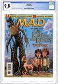 Cover by Dale Stephanos. Stories and art by Drew Friedman, Al Jaffee, Dick DeBartolo, Anthony Barbieri and Bill Wray, Mike Snider, Jeff Kruse, Barry Liebmann, Andrew J. Schwartzberg, Dave Croatto, John Caldwell, Butch D'Ambrosio, Greg Leitman, David Shayne, Desmond Devlin, Tom Richmond, Irving Schild, Timothy Shamey, Harry North, Esq., Ray Alma, Hermann Mejia, Tom Bunk, Peter Kuper, and Sergio Aragones. A parody of the second Lord of the Rings movie. Mad 's version of the 2003 Oscars, featuring art by noted caricaturist Drew Friedman and the Usual Gang of Idiots. Mad's takes on gamers, disposable cameras, and home security systems. Monroe, Marginals by Sergio Aragones, and Spy vs. Spy. Bored of the Rings - The Two+ Hours; The Employing Guise; Mad Sizes Up the 2003 Oscars; Monroe and... Discrimination; Spy vs. Spy; A Mad Look at Video Gamers; Disposable Camera Wedding Photos That Didn't Make the Album; The Slo-Man's Advanced Home Security System; Other Medical "Surveys" The Public Never Heard About; Mad's Not So Daring Outtakes from Daredevil; Your Team May Not Be Final Four Material If...; MTV Making the Video: Osama Bin Laden; Fold-In. 8.5-in. x 11-in., 48 pages, PC/PB&W. Cover price $2.99. Grade: CGC 9.8 explanation of grade Condition: Used (collectible)