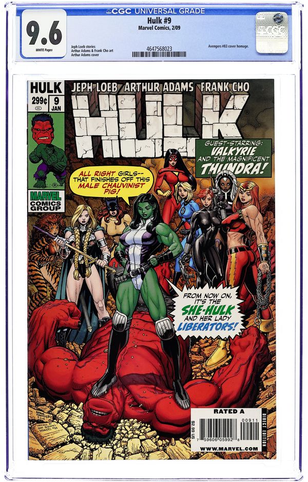 Cover by Art Adams. Written by JEPH LOEB Art by ART ADAMS & FRANK CHO Do ya like ladies? (don't answer that) How 'bout monsters?(hang on) BIG BOMBASTIC BATTLES built by superstar Jeph Loeb? (not yet) And does the idea of seeing JUMUNGOUSLY AMAZING ART ADAMS and FREAKIN' FRANK CHO pages twitter your twutter? (you can answer YES now) IN THIS ISSUE! The LADY LIBERATORS are dead-set on capturing RULK and finding out who he really is...even if he kills 'em! AND...can HULK, SENTRY, MS. MARVEL, and MOON KNIGHT stop the WENDIGO ARMY from killing everyone in Vegas? What about the WENDIHULK!? (or is it HULKDIGO!?) Plus, a tale of the colorful Hulks by Audrey Loeb & Chris Giarrusso. 32 PGS./Rated A Cover price $2.99. Grade: CGC 9.6 explanation of grade Condition: Used (collectible)