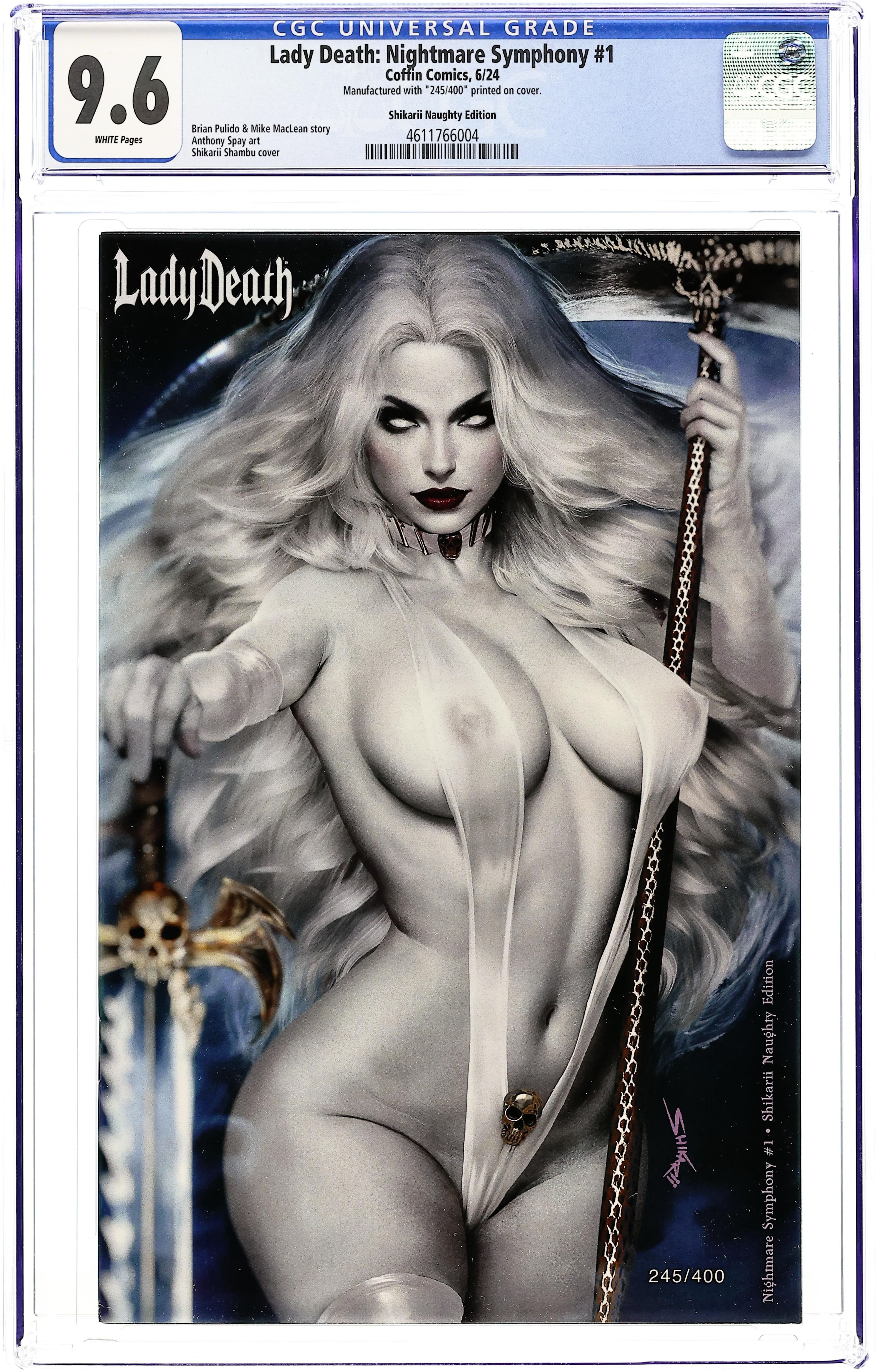 'Shikarii Naughty' Edition Variant Cover by Shikarii Shambu - limited to 400 copies. Written by Brian Pulido and Mike MacLean. Art by Anthony Spay. Lady Death and the Hellraiders are headed to earth to fend off the extinction level villainy of The Sect and The Trinity, and certainly we will get to that crucial story, but first lets delve back into the past, before Lady Death's 'Cursed Sleep' began two decades ago and discover what diabolical treachery occurred during a rare peaceful moment in the Lady's undead life⦠32 pages, full color. Grade: CGC 9.6 explanation of grade Condition: Used (collectible) unless item is a new release