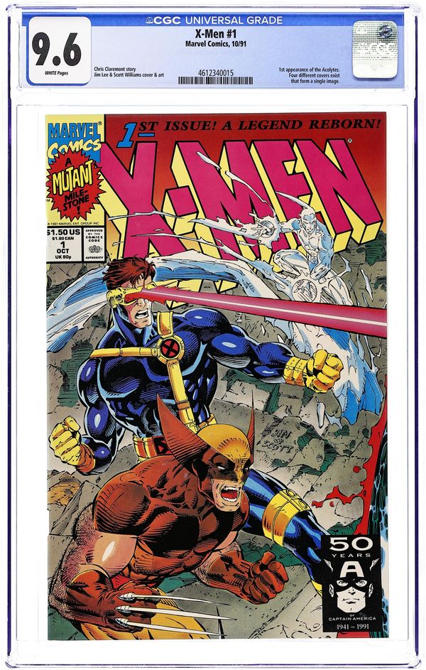 Ended Nov 24 10:12 PM CST Bid History 11 bids Winning Bid $42 Direct Edition. Cyclops/Wolverine/Iceman cover. Cover pencils by Jim Lee, inks by Scott Williams. Rubicon, script by Jim Lee (Co-Plot) and Chris Claremont, pencils by Jim Lee, inks by Scott Williams; Magneto forms the Acolytes and proclaims Asteroid M a haven for mutants everywhere; But the rest of the world doesn't see it that way; Nick Fury cameo. 2-page pin-up: gallery of X-Men villains. X-Men Sketchbook by Jim Lee. Cover price $1.50. NOTE: Cover C connects to covers 1A, 1B, and 1D to form a single giant image. Cover price $1.50. Grade: CGC 9.6 explanation of grade Condition: Used (collectible)