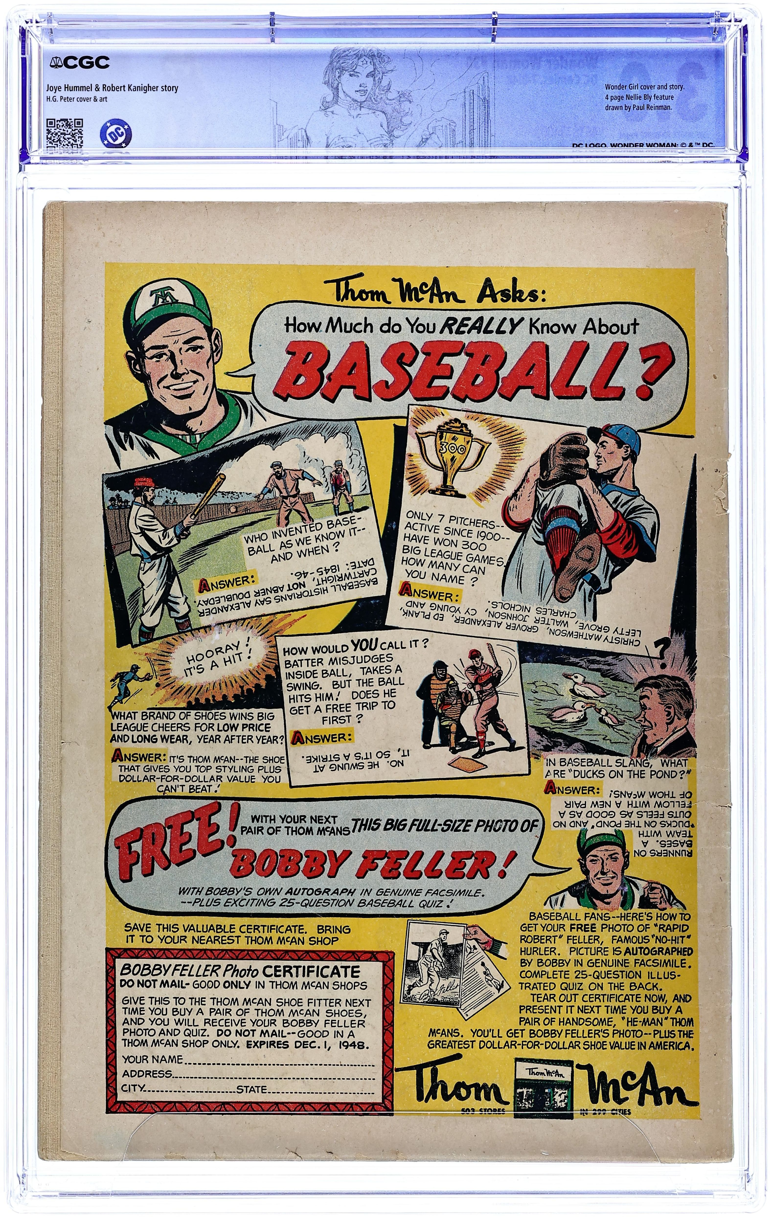 Starts Jan 3 Cover by Harry G. Peter. "The Secret of the Limestone Caves," script by Joye Hummel (as Charles Moulton), art by Harry G. Peter; Olive, an Amazon trainee, learns to temper her Amazon strength with loving kindness after viewing Princess Diana in action against the Radium Giants. Wonder Women of History: three-page Lynde Dix bio, art by Paul Reinman. "The Song of the Sirens," script by Robert Kanigher, art by Harry G. Peter; The jealousy of Steve's old girlfriend turns deadly when she acquires an armlet that gives her an irresistible power over men. "A Human Bomb," art by Harry G. Peter; Wonder Woman helps a female candidate for prison warden transform a women's prison into a model facility using Amazon methods of rehabilitation, all while fighting off the sabotage attempts of her competitor. Wonder Women of History: three-page Nellie Bly bio, art by Paul Reinman. Two-page text story, "Race to the Top of the World" by Charles King. One-page Tootsie Roll ad, "Captain Tootsie Traps the Circus Culprit" (art by C.C. Beck). 52 Pages, Full Color. Cover price $0.10. Grade: CGC 3.0 explanation of grade Condition: Used (collectible)