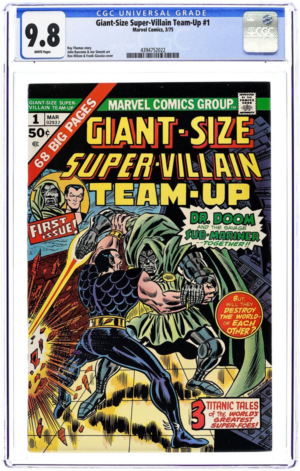 "Encounter at Land's End!" Script by Roy Thomas. Pencils by John Buscema. Inks by Joe Sinnott. Cover by Ron Wilson and Frank Giacoia. Following his defeat in Fantastic Four #144, Doctor Doom and the Sub-Mariner duke it out in the Atlantic Ocean. Flashback cameos by the Fantastic Four, Darkoth, Shalla Bal, and the Silver Surfer. First reprint story: "In the Darkness Dwells Doom!" Script by Roy Thomas. Pencils by John Buscema. Inks by Johnny Craig. While running from the police, the Sub-Mariner seeks shelter in the Latverian Embassy. Of course he meets Doctor Doom...who else? Story originally published in Sub-Mariner #20. Second reprint story: "This Man – This Demon!" Story by Larry Lieber and Roy Thomas. Pencils by Larry Leiber and Frank Giacoia. Inks by Vince Colletta. Dr. Doom enters into an uneasy alliance with Diablo in order to see Valeria again. Story originally published in Marvel Super-Heroes (1st series) 20. (Notes: The two reprint stories are intertwined with the feature story in this issue. Doctor Doom appears next in Fantastic Four #155. The two-issue Giant-Size Super-Villain Team-Up series preceded the Super Villain Team-Up series. The first issue of the regular SVTU series was published in August 1975. This issue includes a one-page essay from Roy Thomas explaining the plans for Super-Villain Team-Up.) 64 pages Cover price $0.50. Grade: CGC 9.8 explanation of grade Condition: Used (collectible)