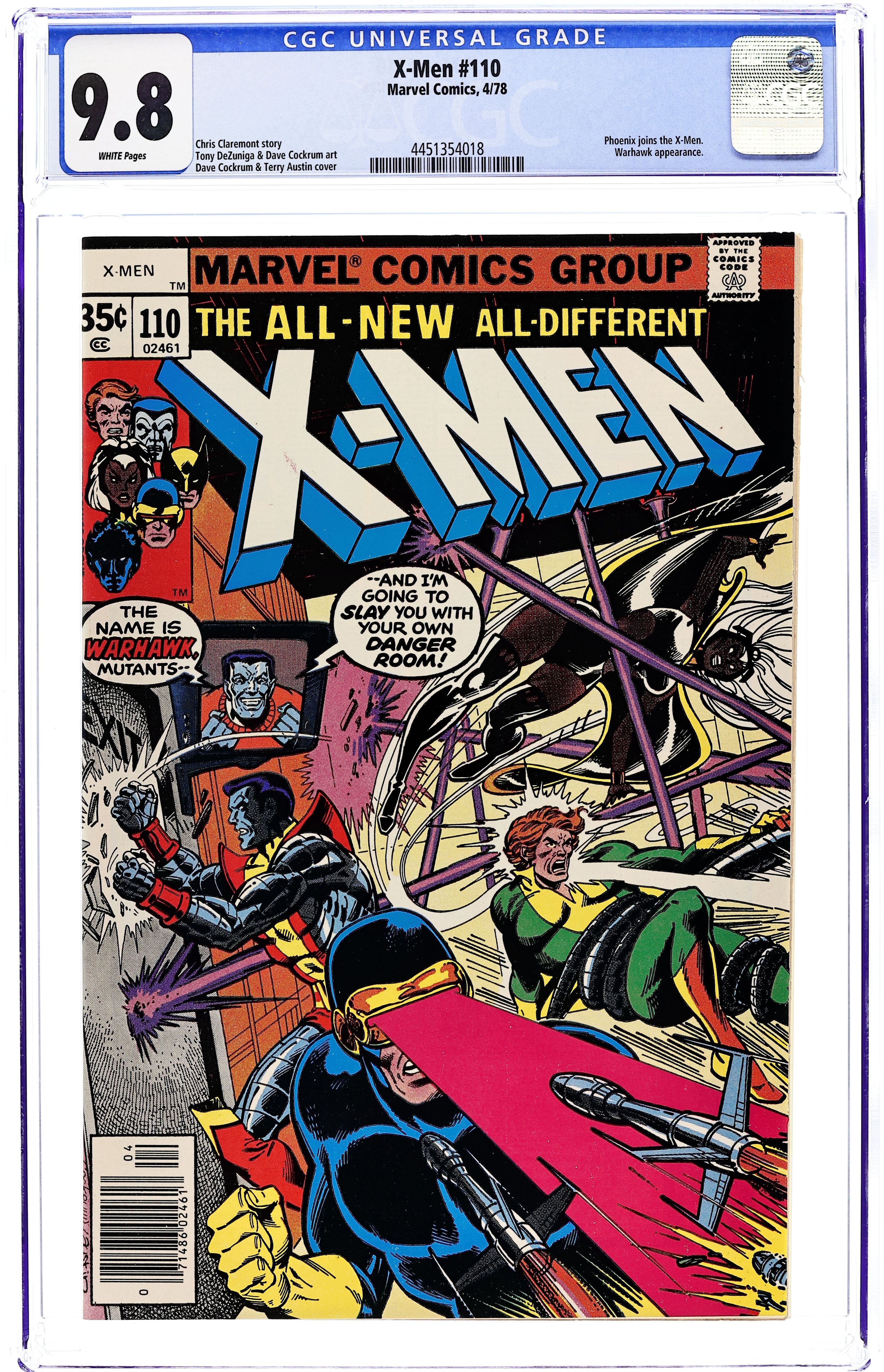 "The 'X'-Sanction!" Story by Chris Claremont. Art by Tony DeZuniga, Dave Cockrum. Cover by Dave Cockrum and Terry Austin. Can the new team survive an encounter with the deadly Warhawk?! 36 pgs. Cover price $0.35. Grade: CGC 9.8 explanation of grade Condition: Used (collectible)