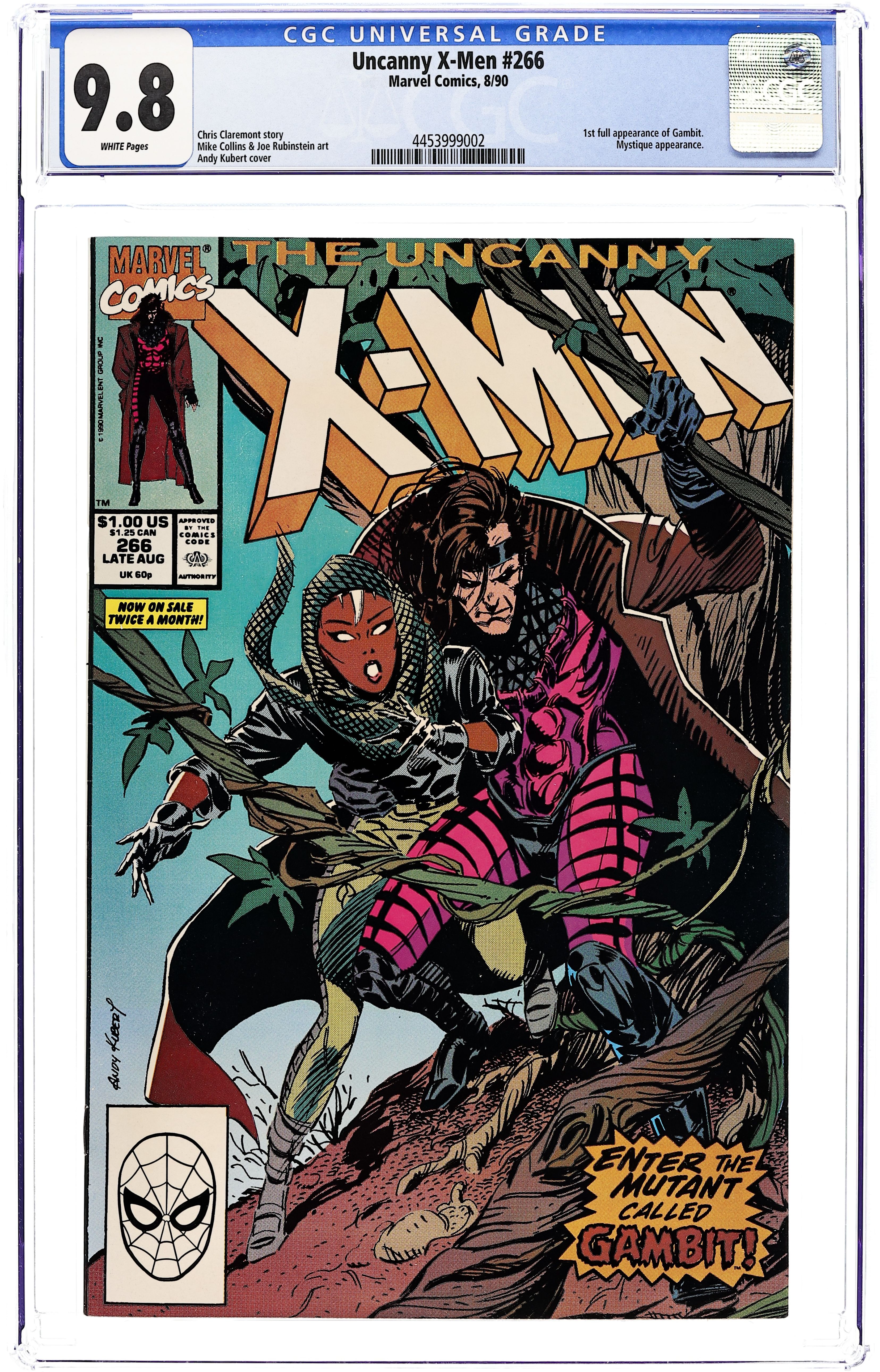 Direct Edition. "Gambit!" Part 2 of 3. Story by Chris Claremont. Art by Mike Collins and Joe Rubinstein. Cover by Andy Kubert. The Hounds are closing in on the young thief named Storm. Her only hope may lie in the hands of a mysterious and charming stranger. Plus, the Shadow King wants Mystique dead. NOTE: 1st appearance of Gambit. 36 pages, full color. Cover price $1.00. Grade: CGC 9.8 explanation of grade Condition: Used (collectible)
