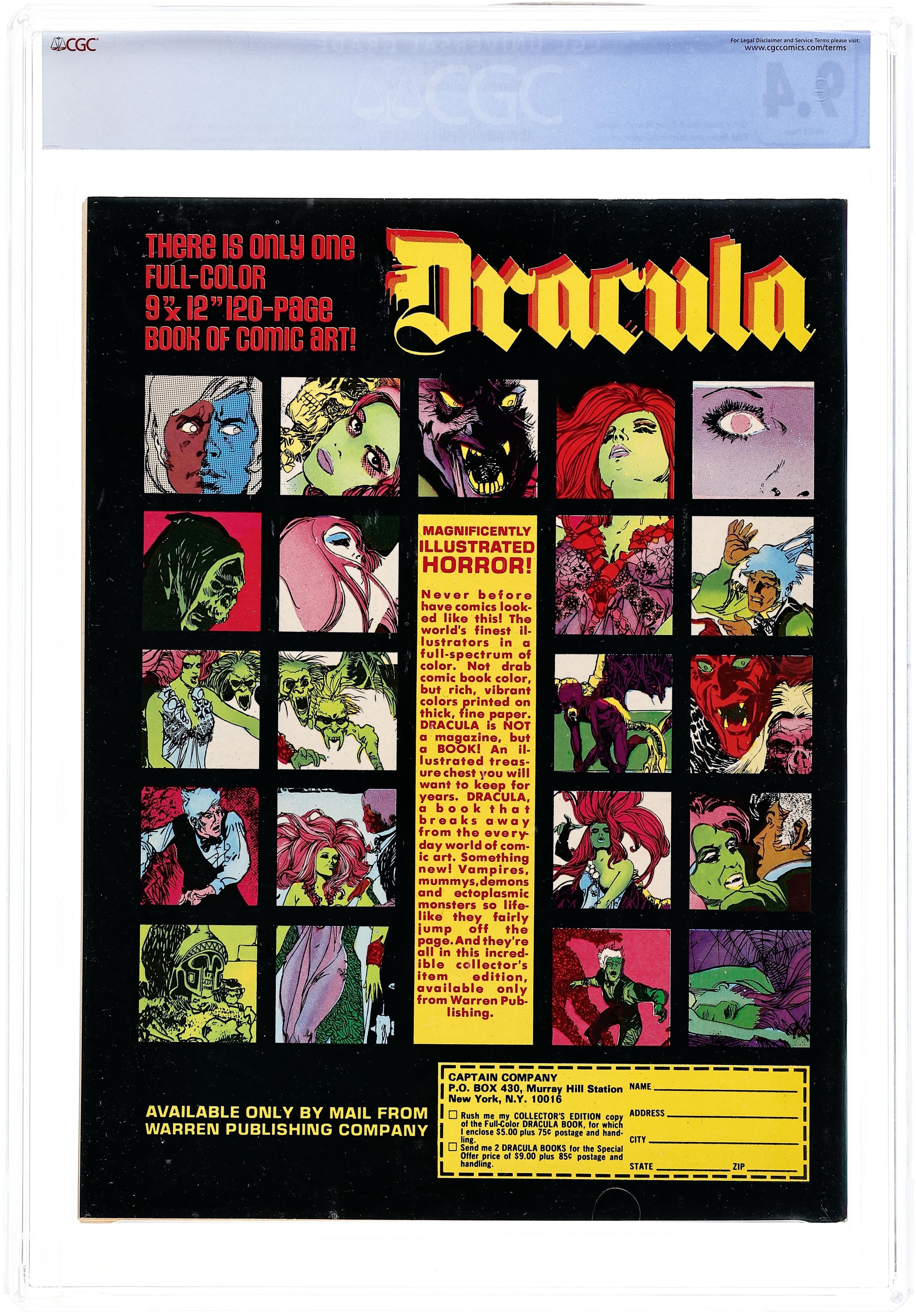 Stories in this issue include: The Mummy Walks: Stranger in a Village of the Insane by Steve Skeates and Jaime Brocal; Curse of the Werewolf: To Cure this Curse by Steve Skeates and Martin Salvador; Hunter part three by Rich Margopoulos and Paul Neary; The Christmas Spirit of 1947 by Will Eisner (in color); Schreck: Bright Eyes by Doug Moench and Vicente Alcazar; and Doctor Archaeus: The Evil that Men Do by Gerry Boudreau and Isidro Mones. Includes 1973 Warren Awards. Cover art by Manuel Sanjulian. Cover price $1.00. Grade: CGC 9.4 explanation of grade Condition: Used (collectible)