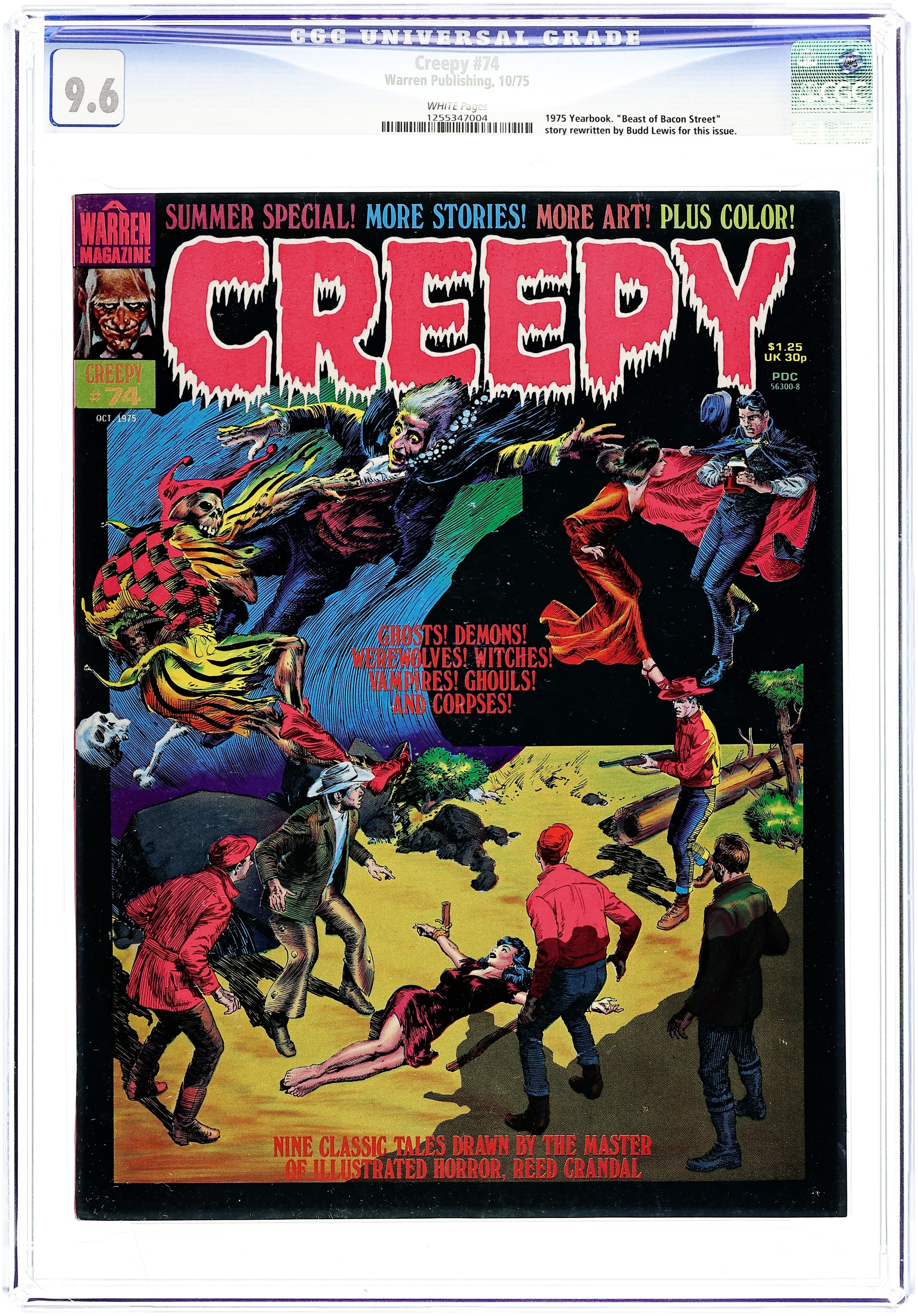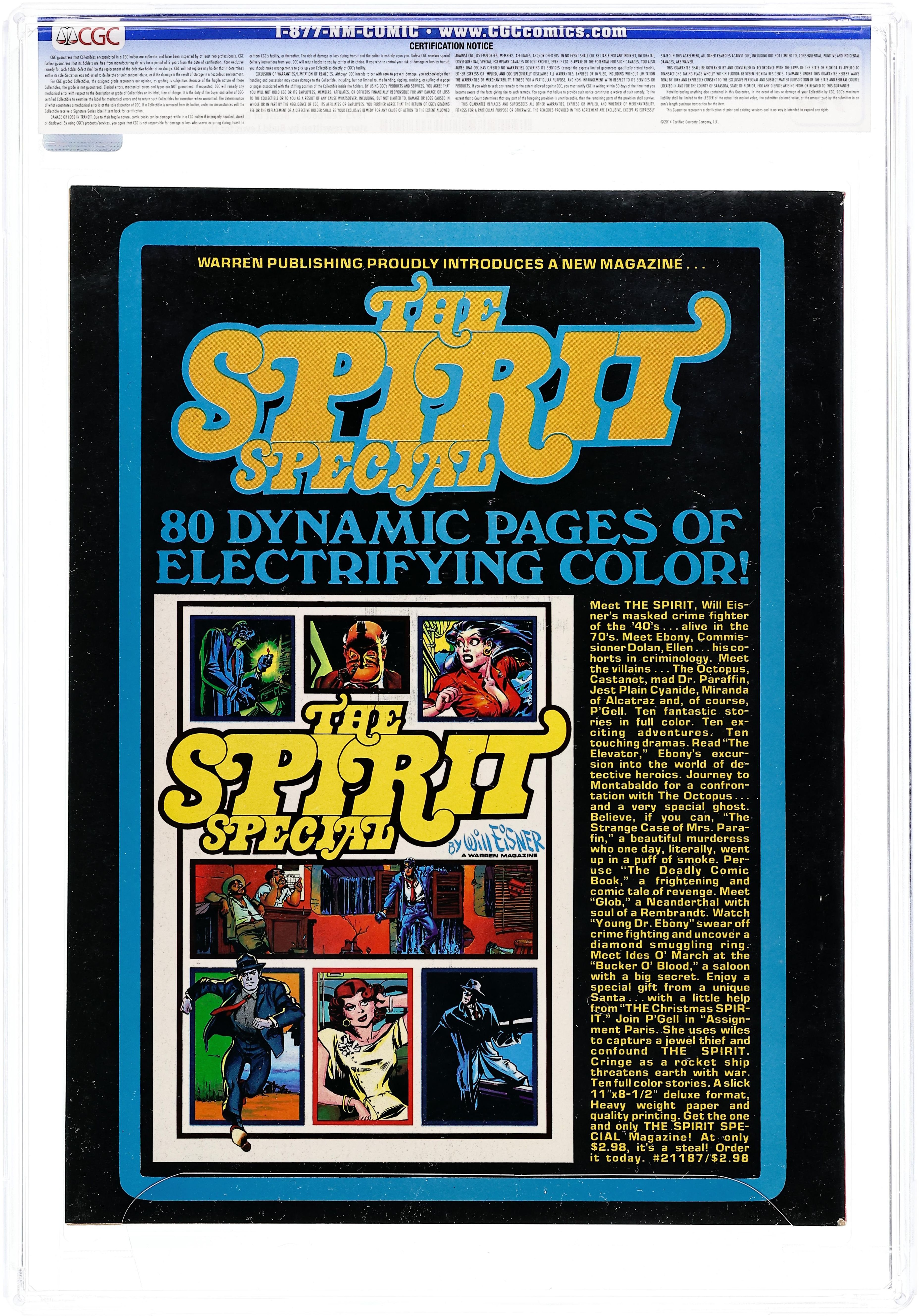 Stories in this issue include: Vampires Fly at Dusk! by Archie Goodwin and Reed Crandall; Curse of the Full Moon! by Archie Goodwin and Reed Crandall; The Cask of Amontillado! by Archie Goodwin and Reed Crandall (from the story by Edgar Allan Poe); Hot Spell! by Archie Goodwin and Reed Crandall; The Beast on Bacon Street by Budd Lewis and Reed Crandall (in color); Hop-Frog! by Archie Goodwin and Reed Crandall (from the story by Poe); The Squaw! by Archie Goodwin and Reed Crandall (from the story by Bram Stoker); Frozen Fear! by Archie Goodwin and Reed Crandall; and Keep your Spirits Up by Bill Parente and Reed Crandall (story miscredited to Archie Goodwin). Cover art is a montage of interior panels. Cover price $1.25. Grade: CGC 9.6 explanation of grade Condition: Used (collectible)