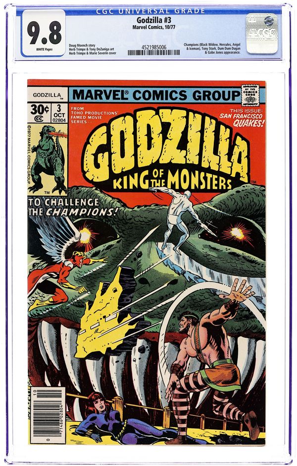 "A Tale of Two Saviors!" Guest-starring the Champions. Story by Doug Moench. Art by Herb Trimpe and Tony DeZuniga. Godzilla's west coast tour continues as the great monster arrives in world famous San Francisco Bay with S.H.I.E.L.D. in hot pursuit. But San Francisco is not without its own heroes. Hercules, Black Widow, Ice Man, and the Angel, otherwise known as the Champions, attempt to halt the King of all Monster's rampage before it is too late. Cover price $0.30. Grade: CGC 9.8 explanation of grade Condition: Used (collectible)