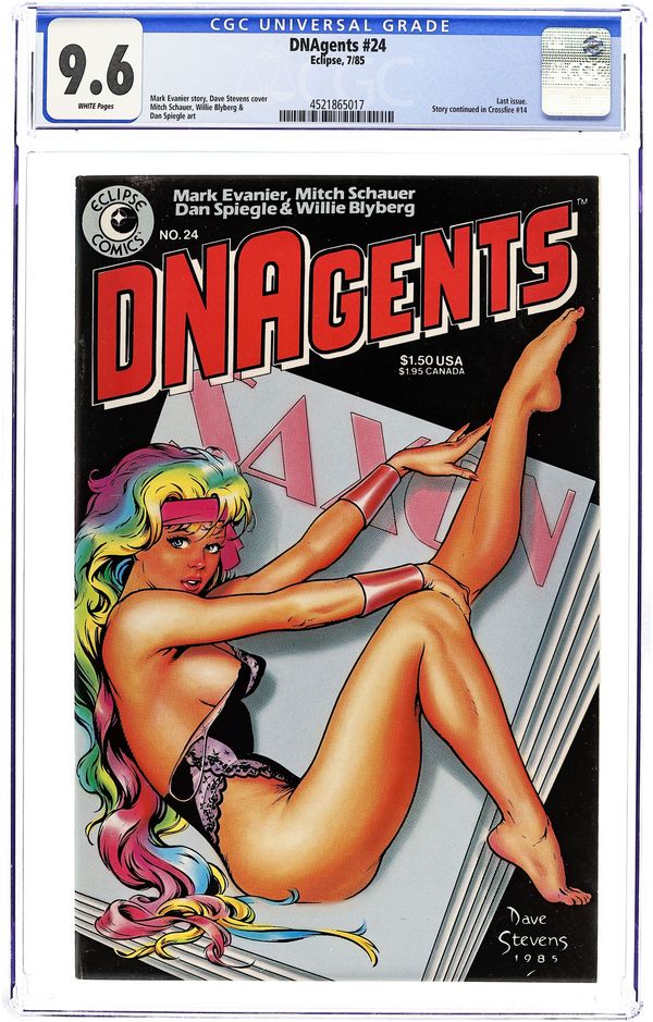 Cover by Dave Stevens. While the DNAgents, with Crossfire's help, try to track down the Detonator, a magazine publisher makes Rainbow a tempting offer in an untitled story. Script by Mark Evanier and art by Mitch Schauer, Willie Blyberg & Dan Spiegle. Cover price $1.50. Grade: CGC 9.6 explanation of grade Condition: Used (collectible)