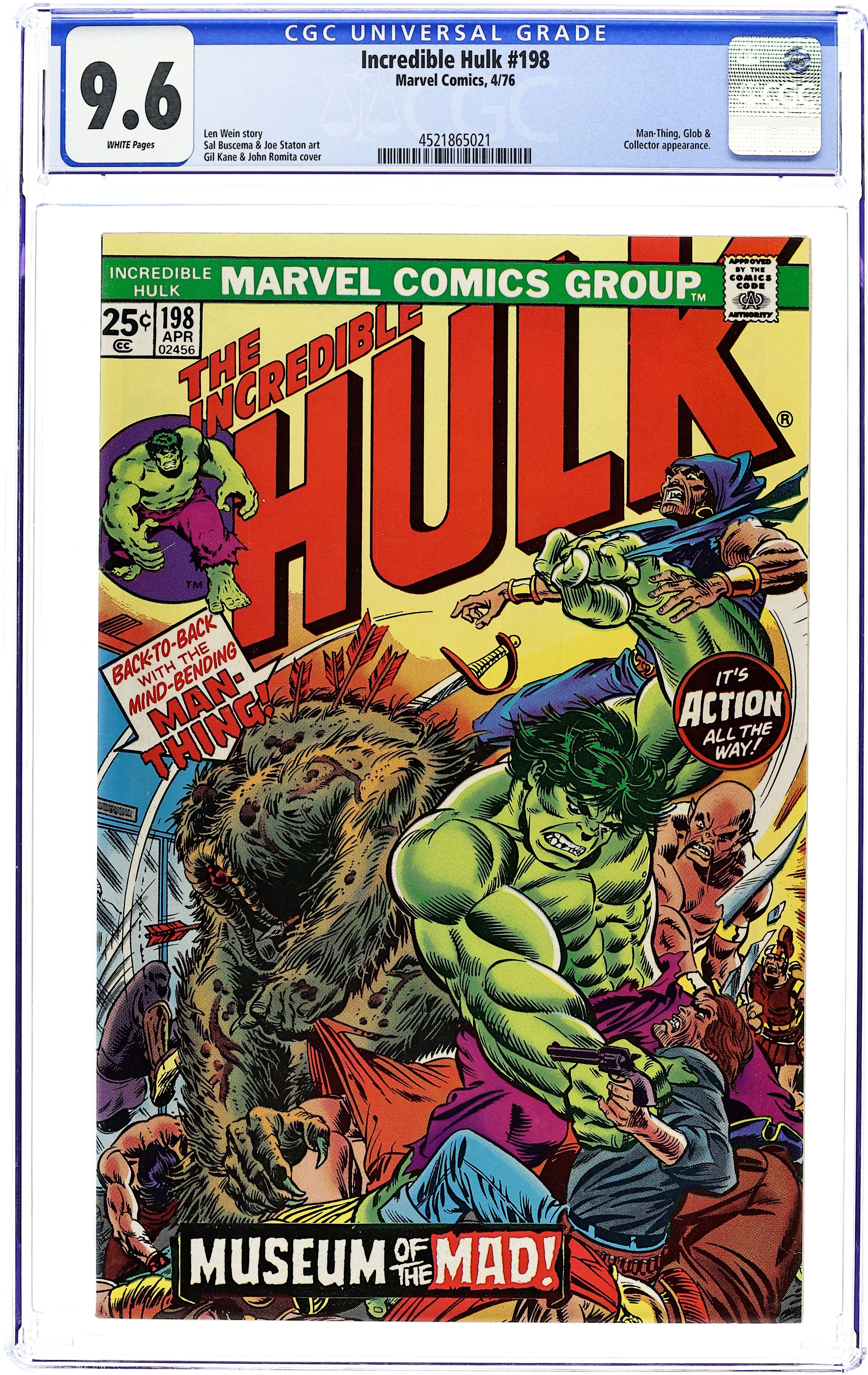 "The Shangri-La Syndrome!" Guest-starring the Man-Thing. Story by Len Wein. Art by Sal Buscema and Joe Staton. As General Ross and S.H.I.E.L.D. plot against our hero, the Hulk is captured along with the macabre Man-Thing by the Elder of the Universe known as the Collector. What happens when you put two of the most feared creatures in the world under one roof? Well, you can be sure that it's not good news for the Collector. 32 pages. Includes a full page Joe Weider ad featuring Arnold Schwarzenegger, Franco Columbo, and other bodybuilding legends. 36 pgs. Cover price $0.25. Grade: CGC 9.6 explanation of grade Condition: Used (collectible)