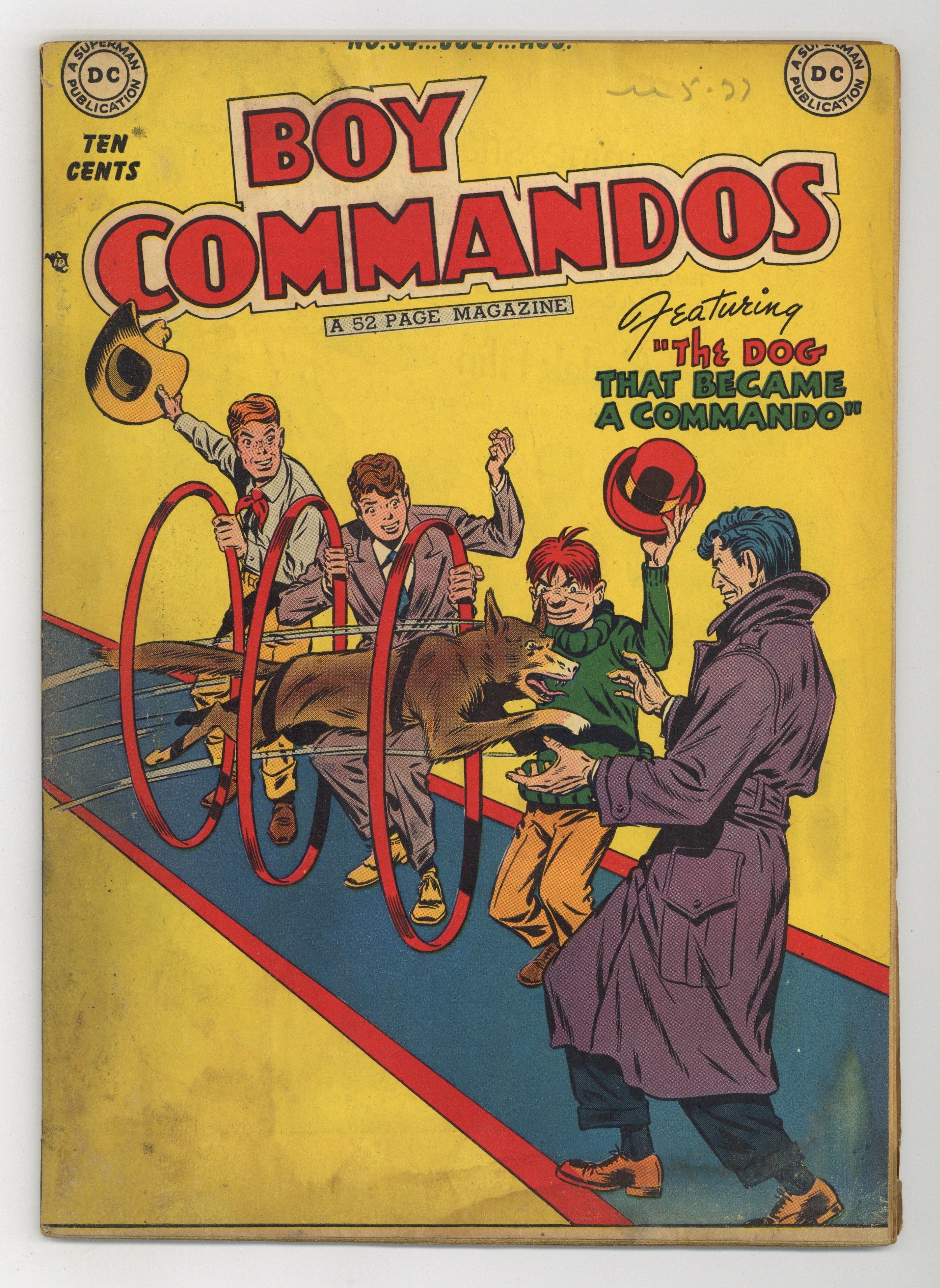 The Dog That Became A Commando, pencils by Carmine Infantino. Captain Tootsie ad for Tootsie Rolls, Tootsie Pops, and Tootsie Fudge, script and art by C. C. Beck. The Battle That Changed History, script by Gardner Fox, pencils by Arthur Peddy, inks by John Giunta; Nineteen buffalo hunters hold off a band of seven hundred Indian warriors with the help of the new Colt Revolver. The Bandit of Mile-High Mountain, pencils by Carmine Infantino; the Commandos help a prince battle a man who apparently cannot be harmed by bullets. Jerry the Jitterbug humor page by Henry Boltinoff. The Rembrandt from Flatbush; Brooklyn gains fame as a painter. A short history of the Coast Guard article by Joe Simon. Ads for All-American Western #108, Dale Evans Comics #6 and Western Comics #10, art by Alex Toth, Bob Oksner, Joe Giella, Bob Oksner, and Howard Sherman. 52 Pages, Full Color. Cover price $0.10. Grade: PR 0.5 explanation of grade Condition: Used (collectible)