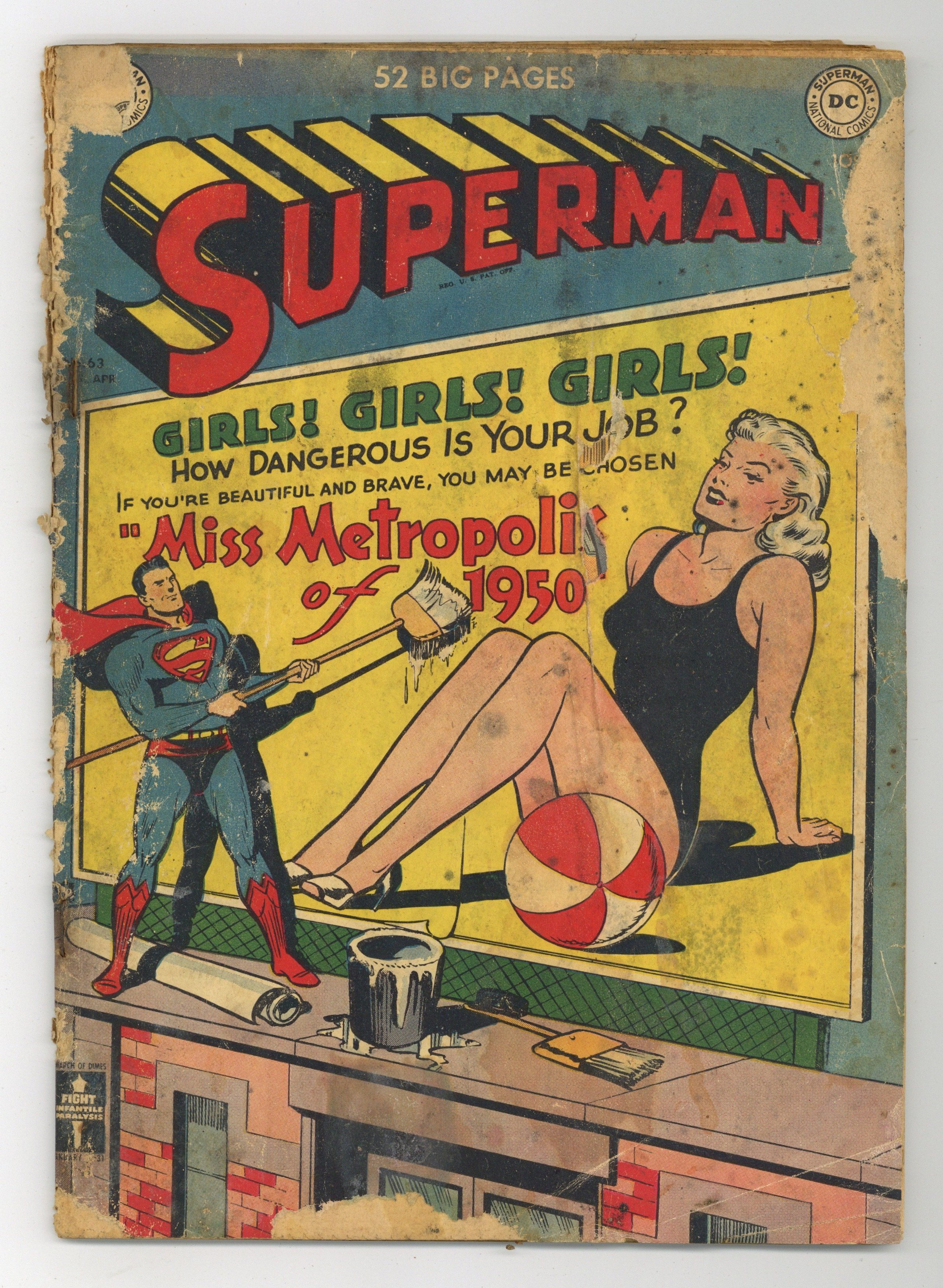 Cover art by Al Plastino. Achilles Vs. Superman, script by Edmond Hamilton, pencils by Wayne Boring, inks by Stan Kaye; John Achilles claims to be the invulnerable descendant of the Greek original. The Wind-Up Toys of Peril, art by Al Plastino; Toyman tries to use Superman toys to make a sap out of the Man of Steel. It's Fun to Be Healthy! public service announcement starring Wonder Woman, script by Jack Schiff, art by Irwin Hasen. Shorty humor two-pager by Henry Boltinoff. Peg humor page by Henry Boltinoff. Miss Metropolis of 1950, pencils by Al Plastino, inks by Stan Kaye; Perry White tries to re-invent the beauty contest by requiring the contestants to perform daring stunts. 52 Pages, Full Color. Cover price $0.10. Grade: PR 0.5 explanation of grade Condition: Used (collectible)