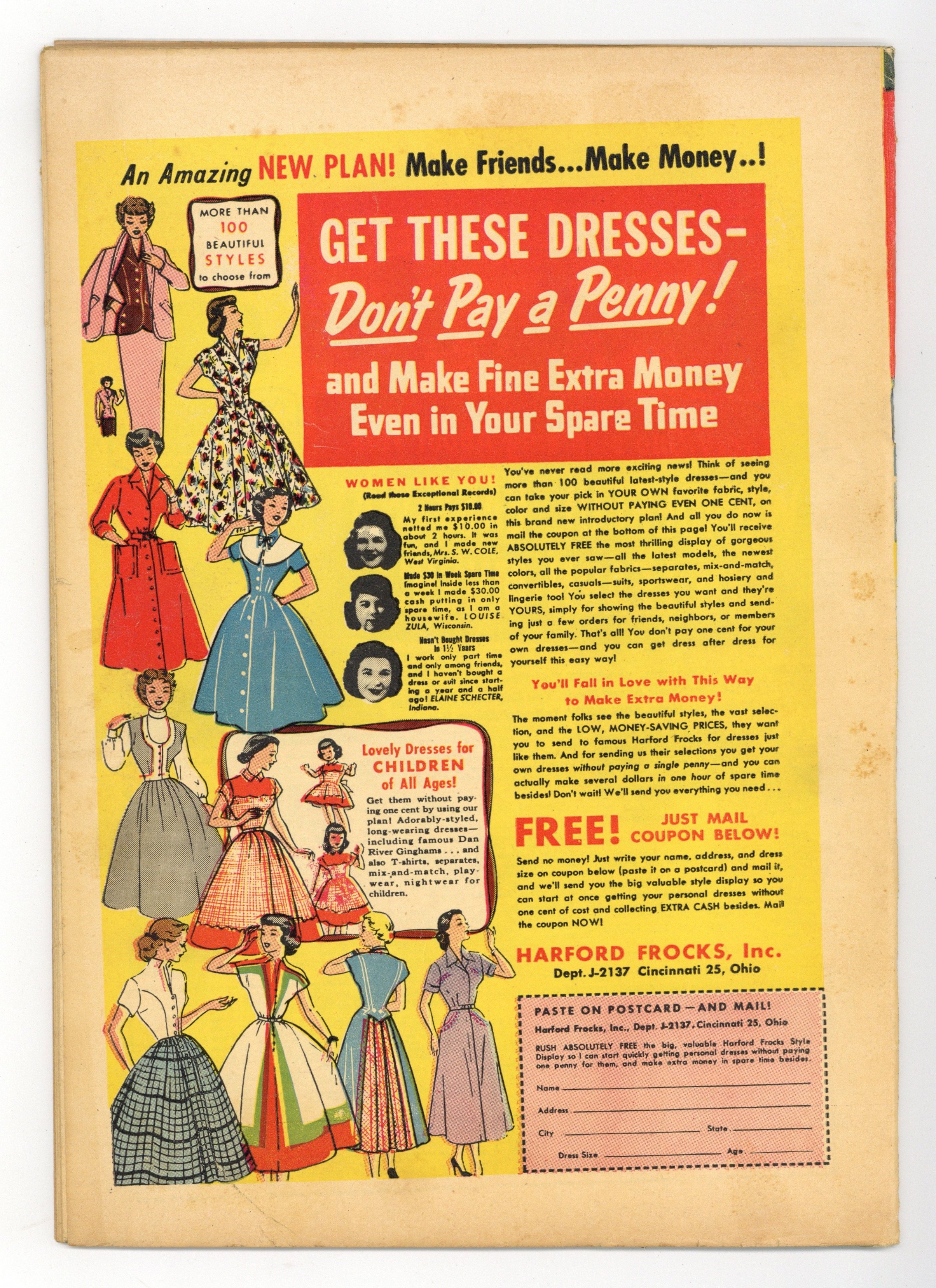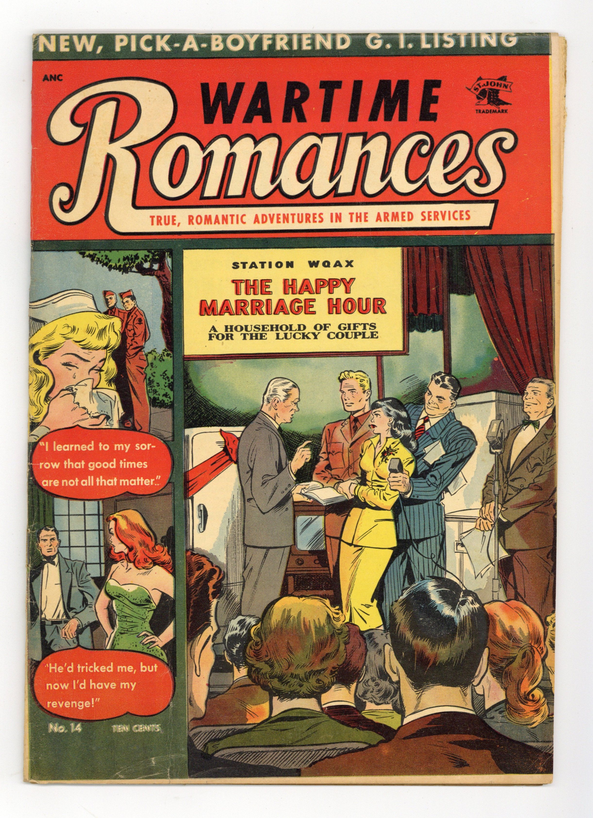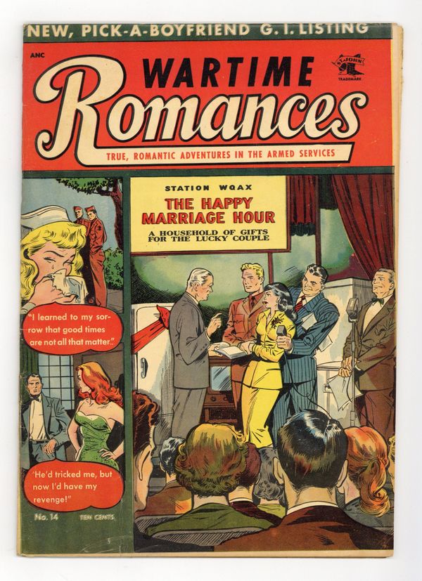 Cover by Matt Baker. Stories and art by Jim Mooney, Bernard Sachs, Dana Dutch, Ben Brown and Dave Gantz. Love plus war equals bittersweet 1950s drama, featuring art by good-girl art legend Matt Baker. Kay and Bill get married on a game show while he's on furlough, then must deal with their families' reactions. Claire doesn't know how to tell hometown steady Bart about her soldier boyfriend Steve, until Steve comes back from overseas on a surprise furlough. Nurse Lynn isn't meeting the right men at the hospital, so she enlists in the Navy. Plus a story with early art by future Marvel artist Jim Mooney. And a letters page offering to connect overseas GIs with romantic pen pals. Marriage on a Dare; Wayward Girl; I Thought I Was Manproof; Correspondence Club; Navy Nurse. 32 pages, Full Color. Cover price $0.10. Grade: VG+ 4.5 explanation of grade Condition: Used (collectible)
