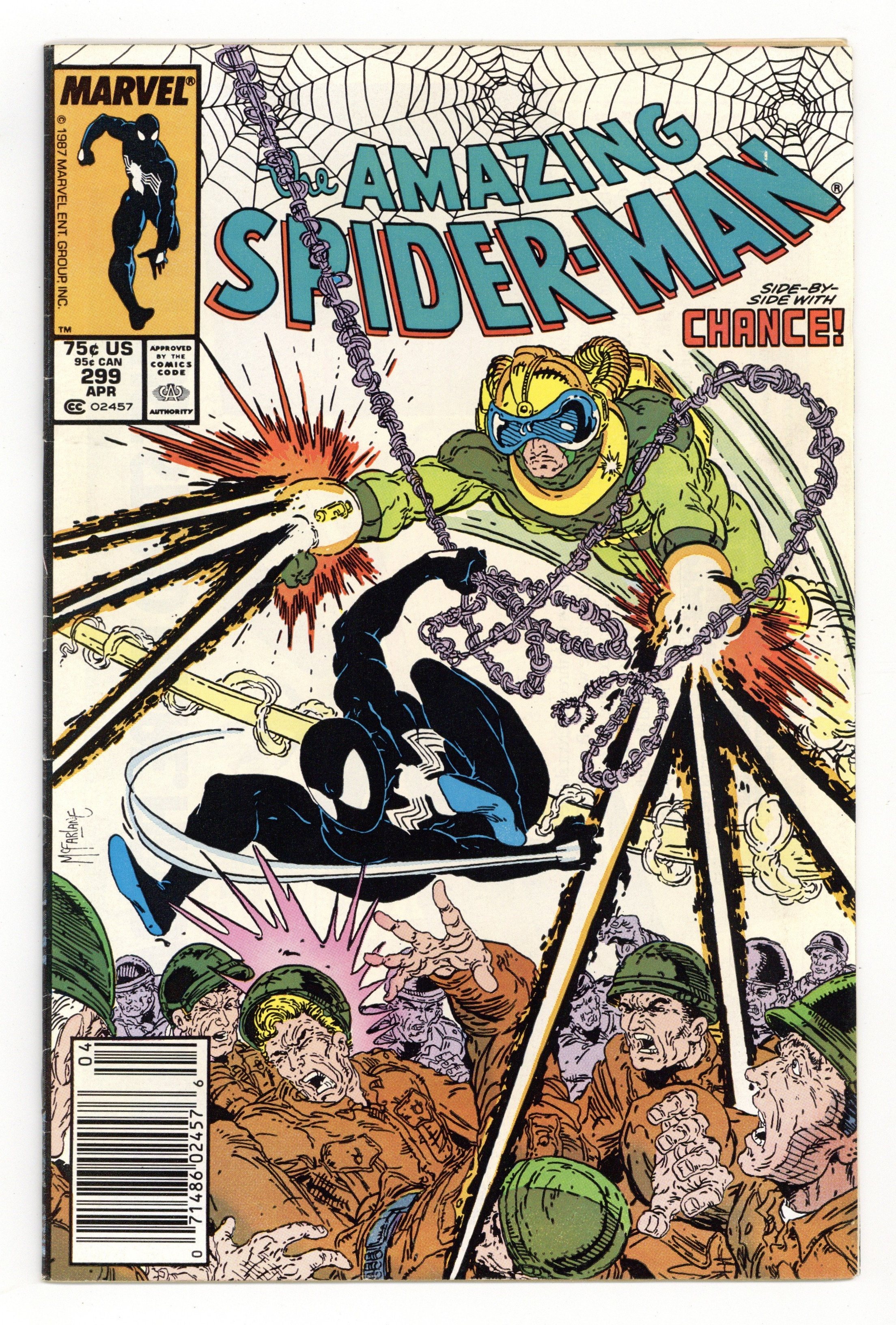 Ended Nov 24 7:14 PM CST Bid History 12 bids Winning Bid $56 Newsstand Edition. "Survival of the Hittist!" Part 2 of 2. Script by David Michelinie. Pencils by Todd McFarlane. Inks by Bob McLeod. Cover by Todd McFarlane. After their waterfront arms theft goes awry, the Life Foundation turns the tables on Chance! The mysterious survivalist group abducts the mercenary and takes him to their secret headquarters in northern New Jersey! But thanks to a well-placed spider tracer, the web-slinger infiltrates the foundation's secluded colony the next day...and rescues Chance! So now the adversaries of 24 hours ago suddenly become allies to avoid death...courtesy of the Life Foundation! First appearance (and cameo on the last page) by Venom. Cameo appearances by Eddie Murphy, Paul Schaffer, and Joe Robertson. Last 75ยข issue. 36 pages, full color. (Note: Chance returns in Amazing Spider-Man 336.) Cover price $0.75. Grade: FN- 5.5 explanation of grade Condition: Used (collectible)