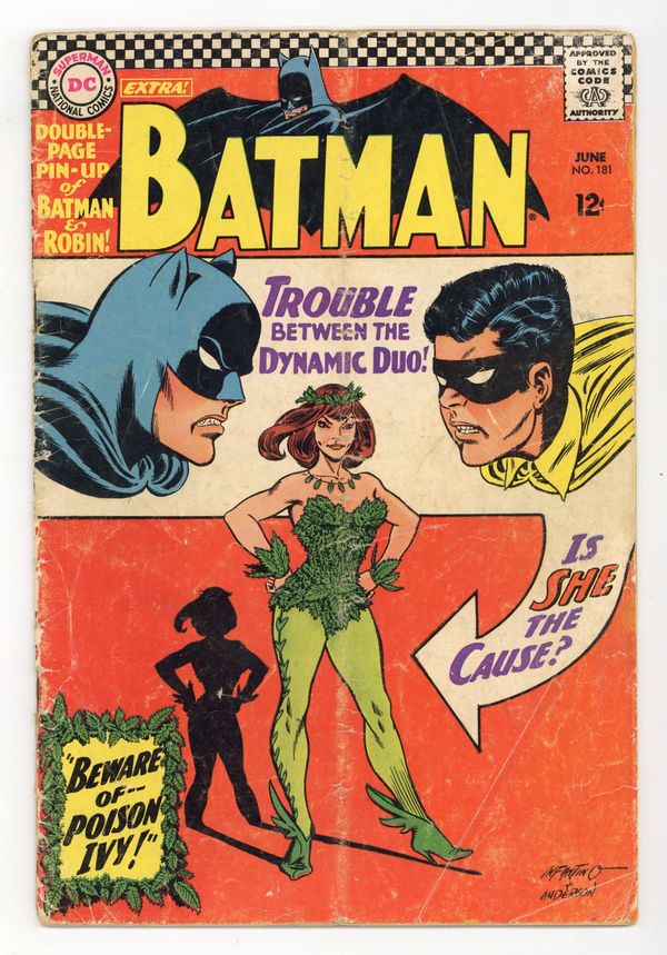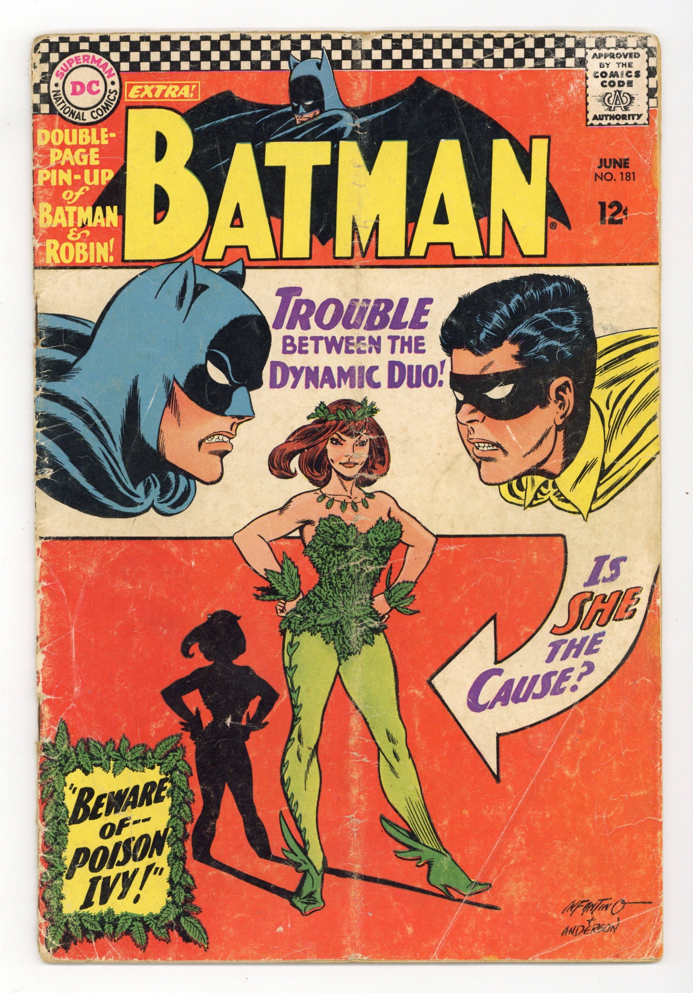 The 1st appearance of Poison Ivy. Cover pencils by Carmine Infantino, inks by Murphy Anderson. "Beware of--Poison Ivy!", script by Robert Kanigher, pencils by Sheldon Moldoff (as Bob Kane), inks by Joe Giella; While Bruce and Dick are attending an art show, a woman shows up, claiming to be the greatest criminal of those currently residing in Gotham. Centerspread is a great two-page color poster of Batman and Robin, pencils by Carmine Infantino, inks by Murphy Anderson. "The Perfect Crime--Slightly Imperfect!", script by Gardner Fox, inks by Sid Greene; At the latest meeting of the Anaylists, Kaye announces that she didn't write her latest book, and seems to be threatened by a voice from her brooch; Batman has a feeling that the Kaye at the meeting is an imposter, so he looks into the matter. Letter from future comics writer Mike Friedrich. Rocky and Bullwinkle star in a one-page Cheerios ad. 36 Pages, Full Color. Cover price $0.12. Grade: PR 0.5 explanation of grade Condition: Used (collectible)