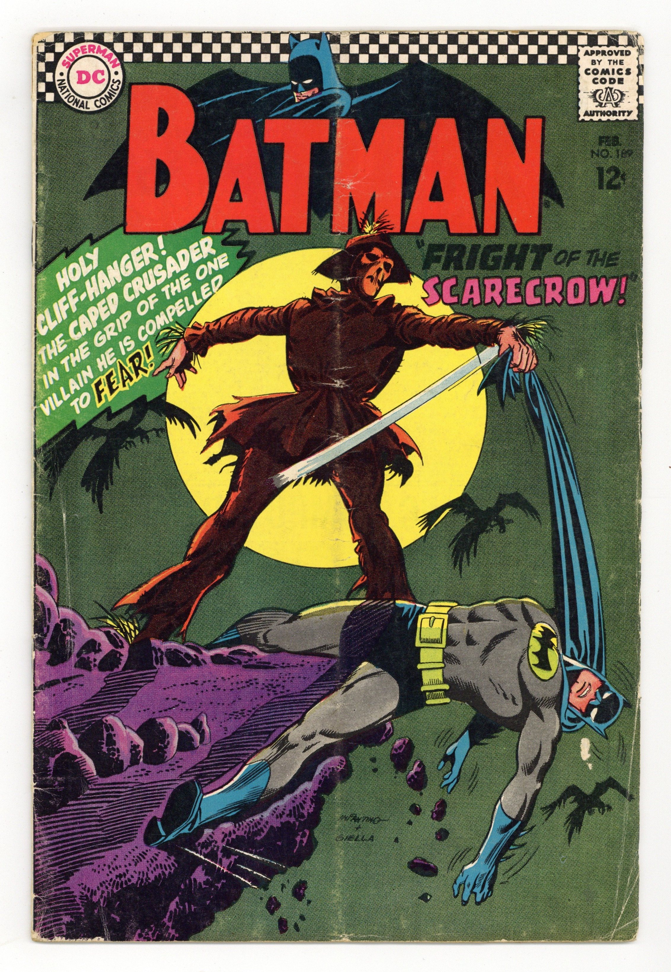 Cover pencils by Carmine Infantino, inks by Joe Giella. 1st Silver Age appearance of Scarecrow in book-length story, "Fright of the Scarecrow!", script by Gardner Fox, pencils by Sheldon Moldoff (as Bob Kane), inks by Joe Giella; While entertaining some children in the park, Dick happens to notice the Scarecrow retrieving buried loot from a past robbery; He calls in Batman and together they battle their old foe until they are blinded by Scarecrow's fear gas. Little Pete humor half-page by Henry Boltinoff. Letter from comic book writer Mark Evanier. Peace on Earth public service announcement. Eyes Front! humor half-page by Henry Boltinoff. 36 Pages, Full Color. Cover price $0.12. Grade: GD/VG 3.0 explanation of grade Condition: Used (collectible)