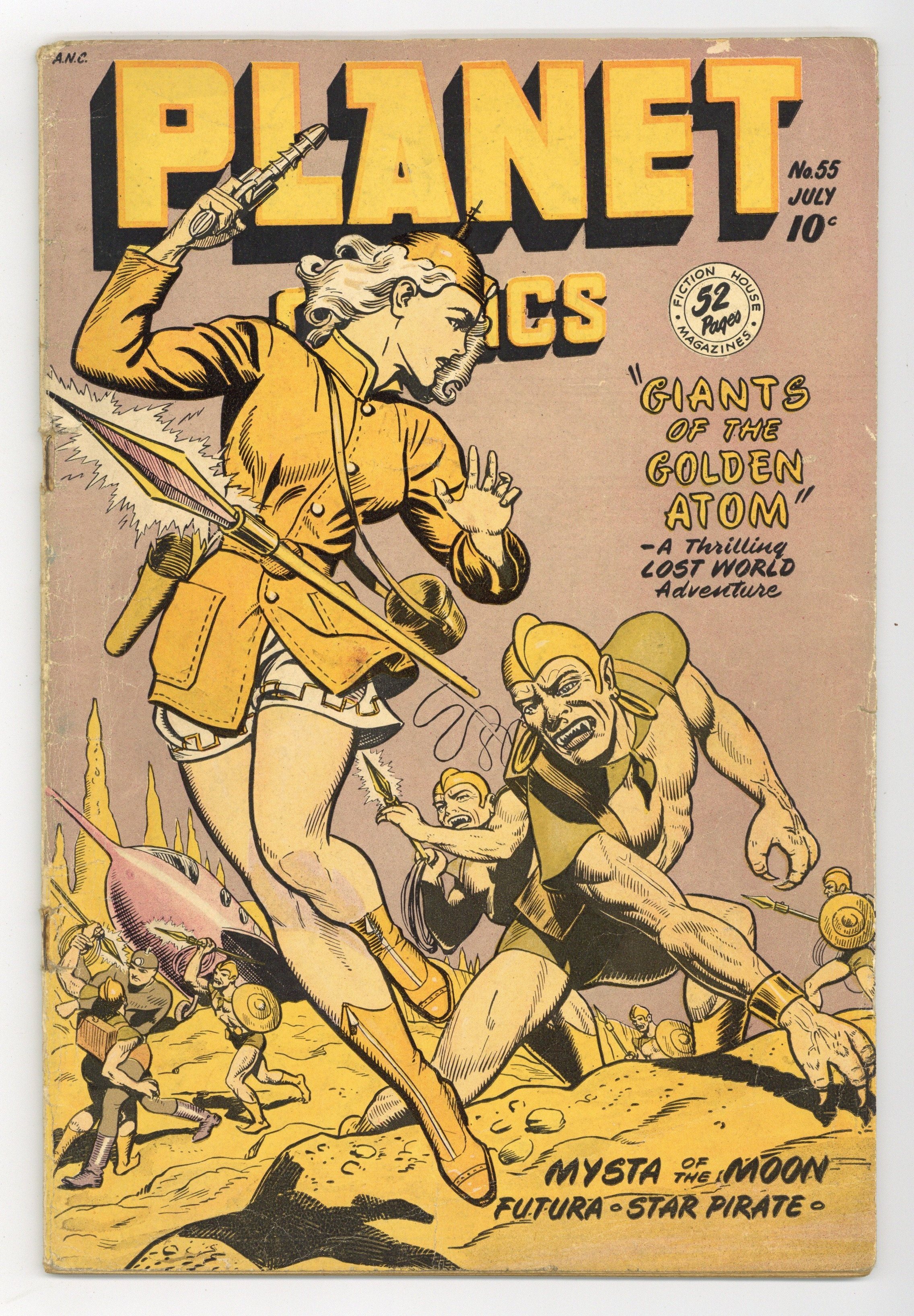 Cover by Joe Doolin. Edited by J. F. Byrne. Stories and art by George Evans, Enrico Bagnoli, Joe Doolin, Frank Doyle, Maurice Whitman, Murphy Anderson and Matt Baker. The first true science fiction comic, Planet Comics featured classic space opera with square-jawed heroes, rockets, rayguns and bug-eyed aliens of every stripe. In the Lost World, Hunt and Lyssa investigate when Boston is frozen over in the middle of July; Mysta assumes a new secret identity as Technician 3A, in a story by good-girl art legend Matt Baker; While seeking spare rocket parts, Auro saves a space princess from a gang of jewel thieves. Another classic Mysta cover by Joe Doolin. The Lost World; Futura; Mysta of the Moon; Auro Lord of Jupiter; Murder on Mercury; Life On Other Worlds: Neptune; Space Rangers; The Star Pirate. 52 pages, Full Color. Cover price $0.10. Grade: GD/VG 3.0 explanation of grade Condition: Used (collectible)
