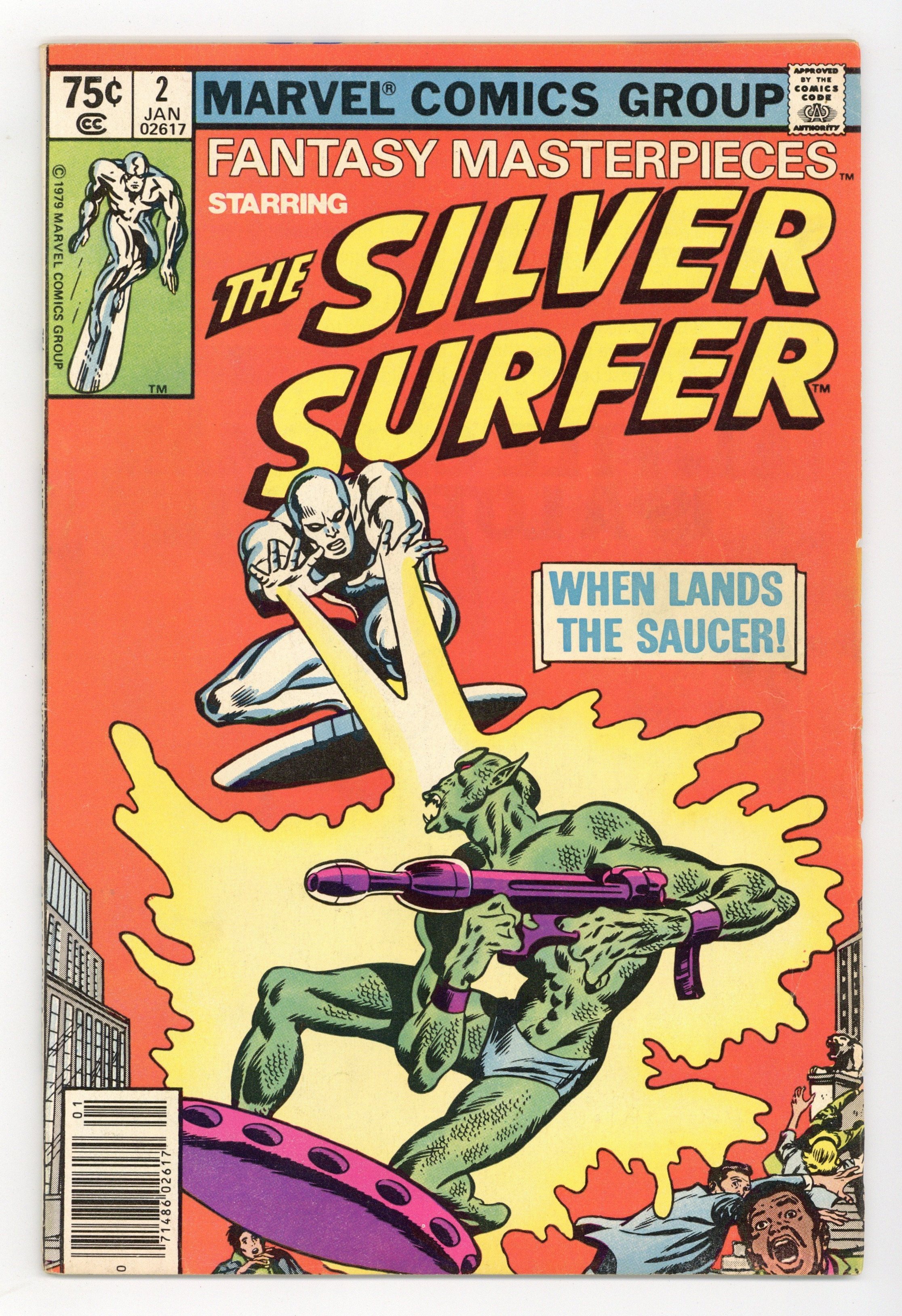 Ended Dec 1 2025 Bid History 5 bids Winning Bid $9 Newsstand Edition. Reprints Silver Surfer (1969 1st Series) #2. "When Lands the Saucer!" Written by Stan Lee. Art by John Buscema and Joe Sinnott. Exiled to planet Earth by his former master, Galactus, the Silver Surfer, a being empowered with the Power Cosmic itself, finds he cannot penetrate the invisible barrier which the Devourer of Worlds has encompassed the planet with. However, this barrier does not prevent others from beyond the stars from coming to Earth and wrecking havoc. Thus, when a malevolent race of aliens descend upon the unsuspecting citizens of Earth, only the Silver Surfer possesses the power to stop them. Cover price $0.75. Grade: VG/FN 5.0 explanation of grade Condition: Used (collectible)
