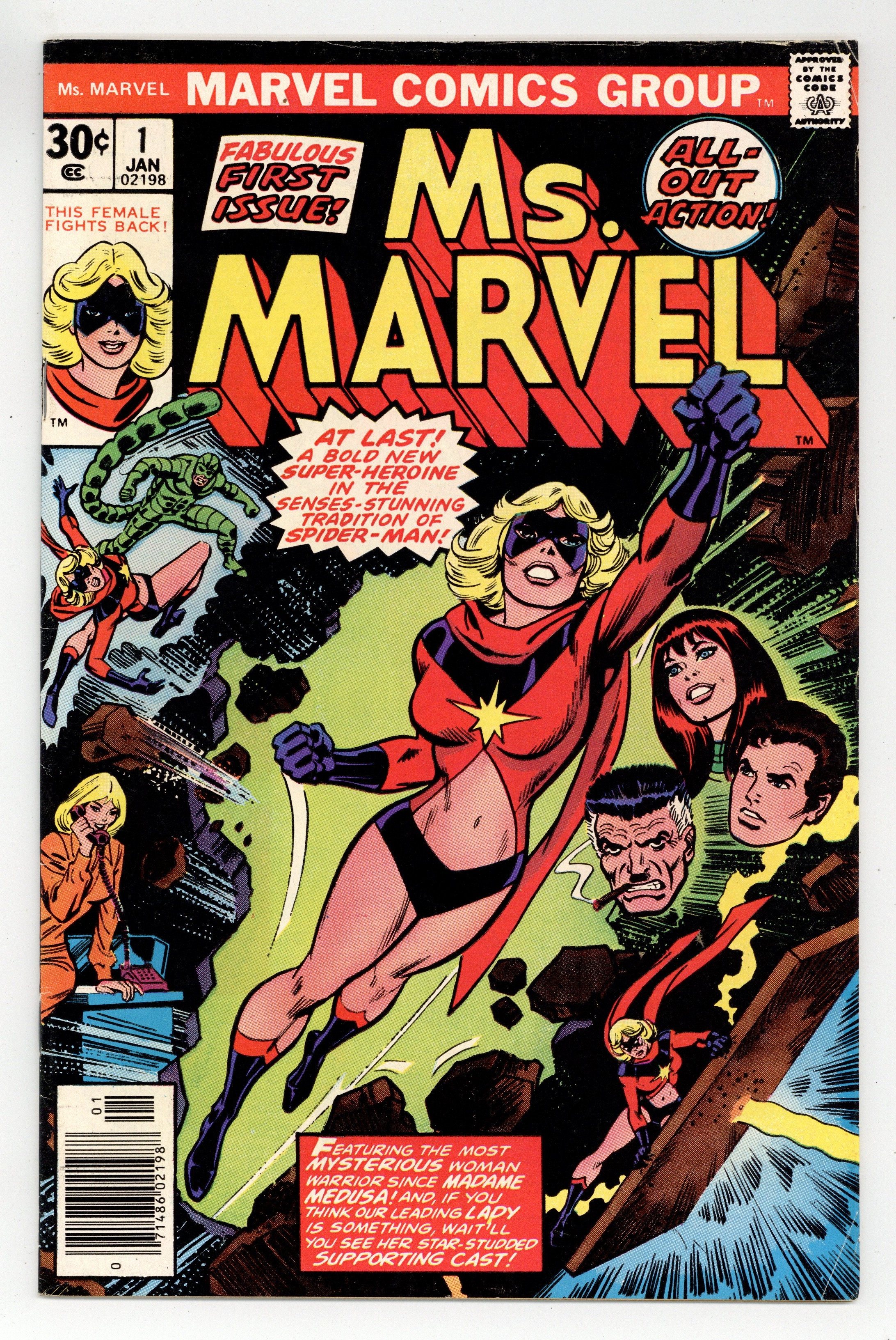 Ended Nov 24 8:56 PM CST Bid History 10 bids Winning Bid $27 John Romita/Dick Giordano cover. John Buscema art. Gerry Conway script. Joe Sinnott/David Hunt inks. Marie Severin colors. "This Woman, This Warrior" Carol Danvers meets Peter Parker, J. Jonah Jameson, Mary Jane Watson, and battles the Scorpion when she gets a job at the Daily Bugle as a fashion editor. Intro Ms. Marvel, Carol Danvers, who last appeared in Captain Marvel # 40. 1st appearance of Ms Marvel. 36 pages, full color. Cover price $0.30. Grade: FN- 5.5 explanation of grade Condition: Used (collectible)