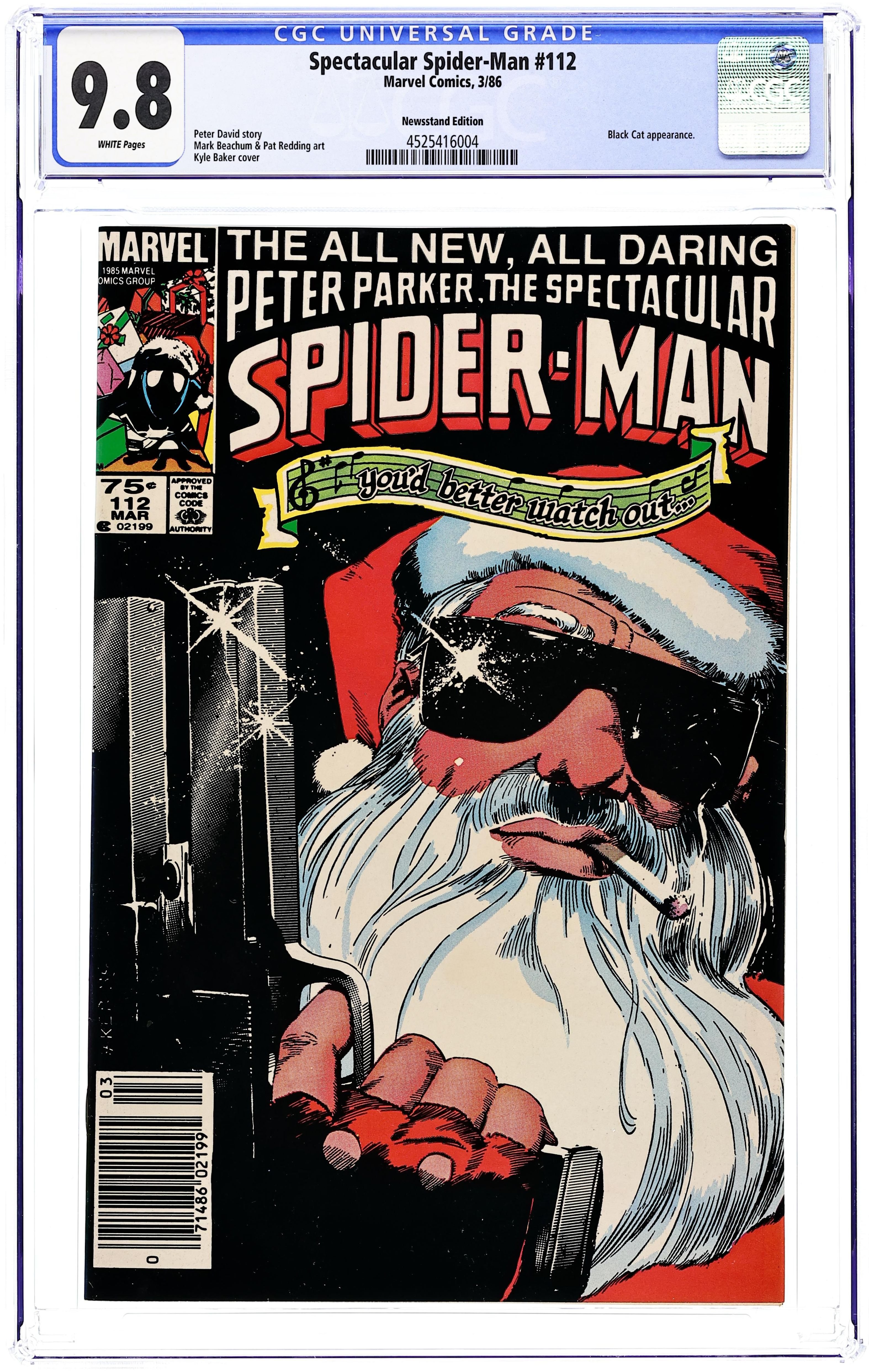 Newsstand Edition. The Black Cat has a brief appearance in "You Never Make a Sound." Script by Peter David (based on a Christmas poem by J. Morris Jones), pencils by Mark Beachum, inks by Pat Redding. Kyle Baker cover. The letters page has a statement of ownership--average print run, 389,794; average paid circulation, 247,916. Cover price $0.75. Grade: CGC 9.8 explanation of grade Condition: Used (collectible)