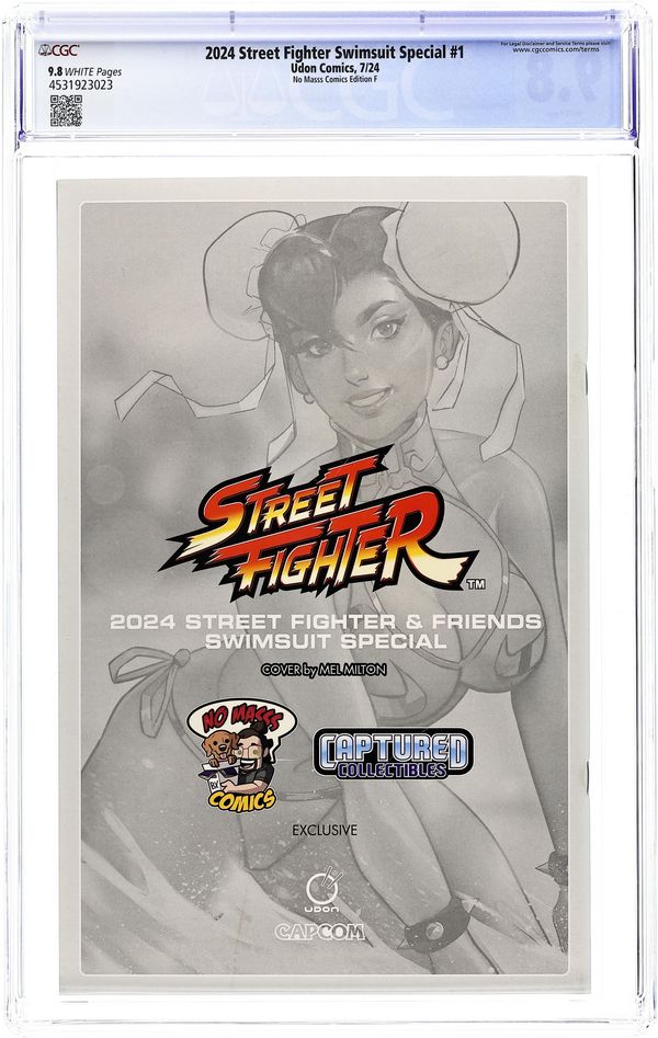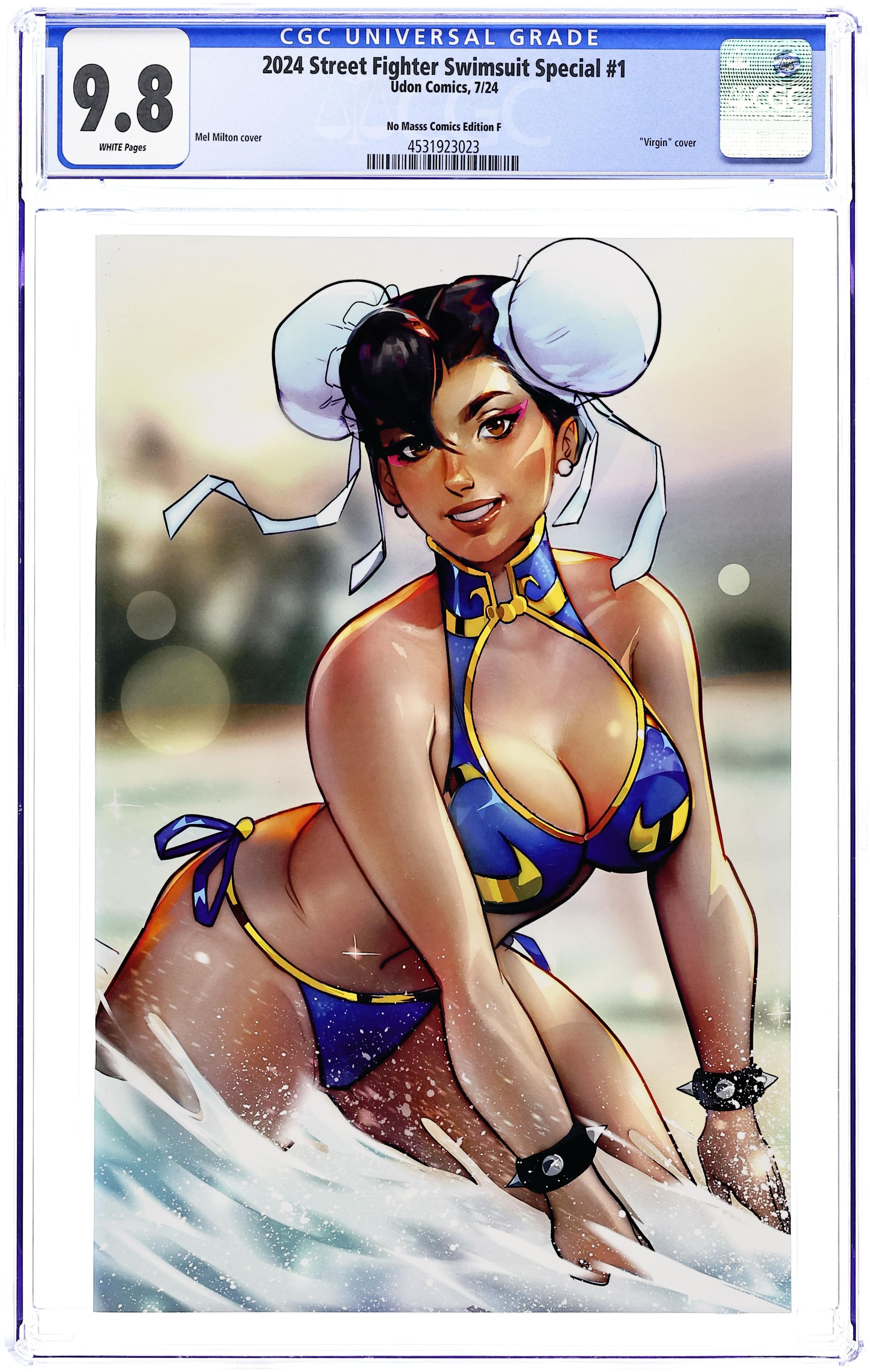 No Masss Comics and Captured Collectibles Exclusive Virgin Cover by Mel Milton. Written by Udon. Art by Various. UDON's annual Street Fighter Swimsuit Special returns with an expanded roster! This time the lovely ladies of Street Fighter are joined by that casts of Darkstalkers, Power Stone, Star Gladiator, Captain Commando, Rival Schools, and more classic Capcom fighting games & beat-em-ups! Hit the beaches with this amazing pin-up special! 32 pages, full color. Grade: CGC 9.8 explanation of grade Condition: Used (collectible) unless item is a new release
