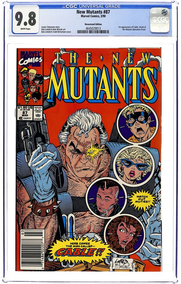 First printing. Newsstand Edition. 1st full appearance of Cable. Liefeld art. Liefeld/McFarlane. Cover pencils by Rob Liefeld, inks by Todd McFarlane. A Show of Power!, script by Louise Simonson, pencils by Rob Liefeld, inks by Bob Wiacek; The Mutant Liberation Front attacks more research stations; Mystique threatens Skids; a federal agent shoots Rusty; he and Skids allow the MLF to rescue them; the New Mutants return to New York; after trying to stop the MLF, Cable weighs his options. Part 2 of 4. 36 pages, full color. Cover price $1.00. Grade: CGC 9.8 explanation of grade Condition: Used (collectible)