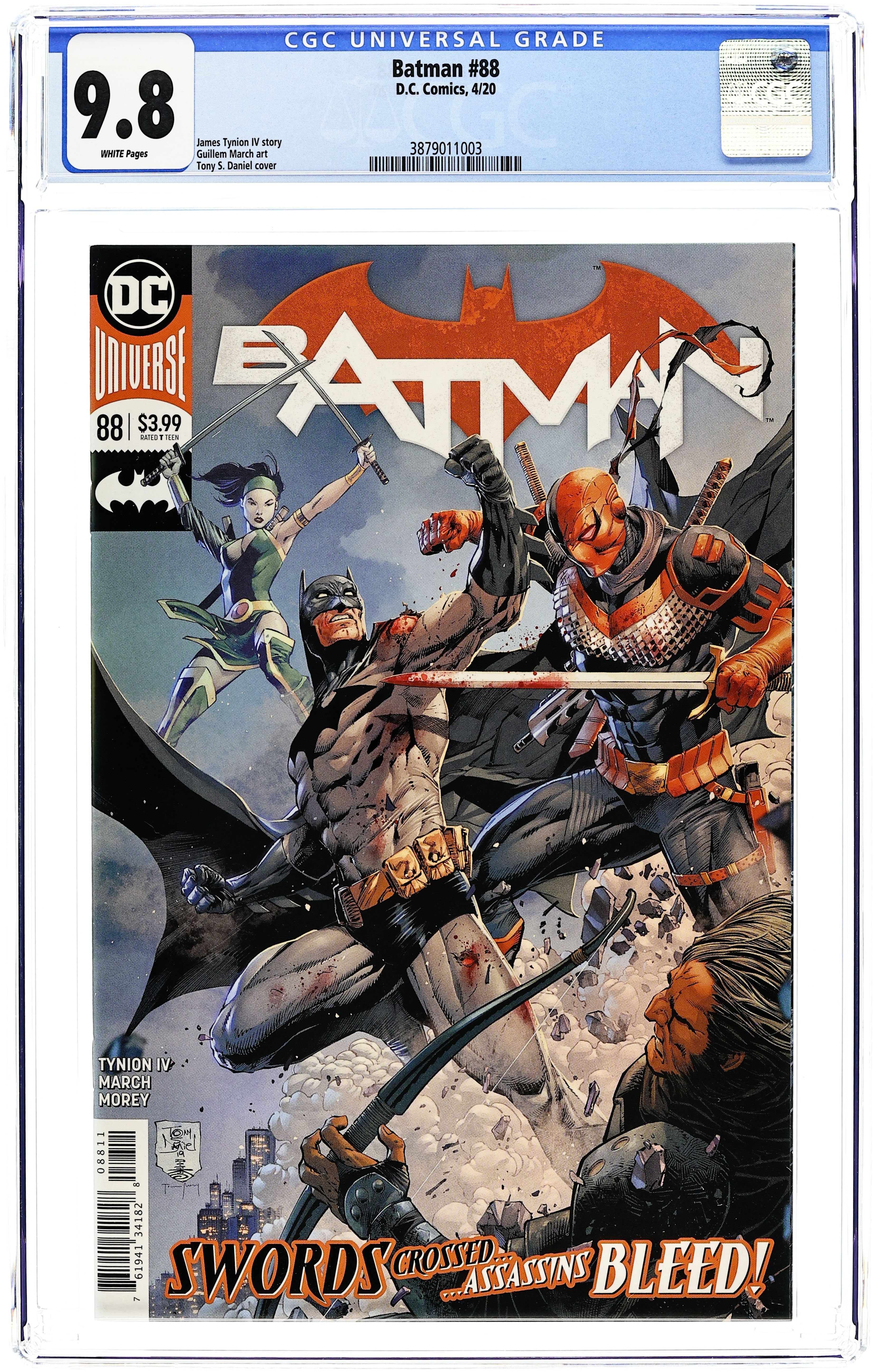 Ended Nov 24 7:35 PM CST Bid History 6 bids Winning Bid $26 Their Dark Designs: Part 3 of 9 - Written by James Tynion IV. Art by Guillem March. Cover by Tony S. Daniel. The conspiracy that will rock Batman's world continues to unfold as the Dark Knight travels to Arkham Asylum to get answers from the Penguin! What dark secret does he share with The Joker, the Riddler, and…Catwoman? Plus, the plague of assassins descending upon Gotham City in its weakest moments continues! Will this be the moment when Deathstroke finally takes down Batman?! 32 pages, full color. Rated T Cover price $3.99. Grade: CGC 9.8 explanation of grade Condition: Used (collectible)