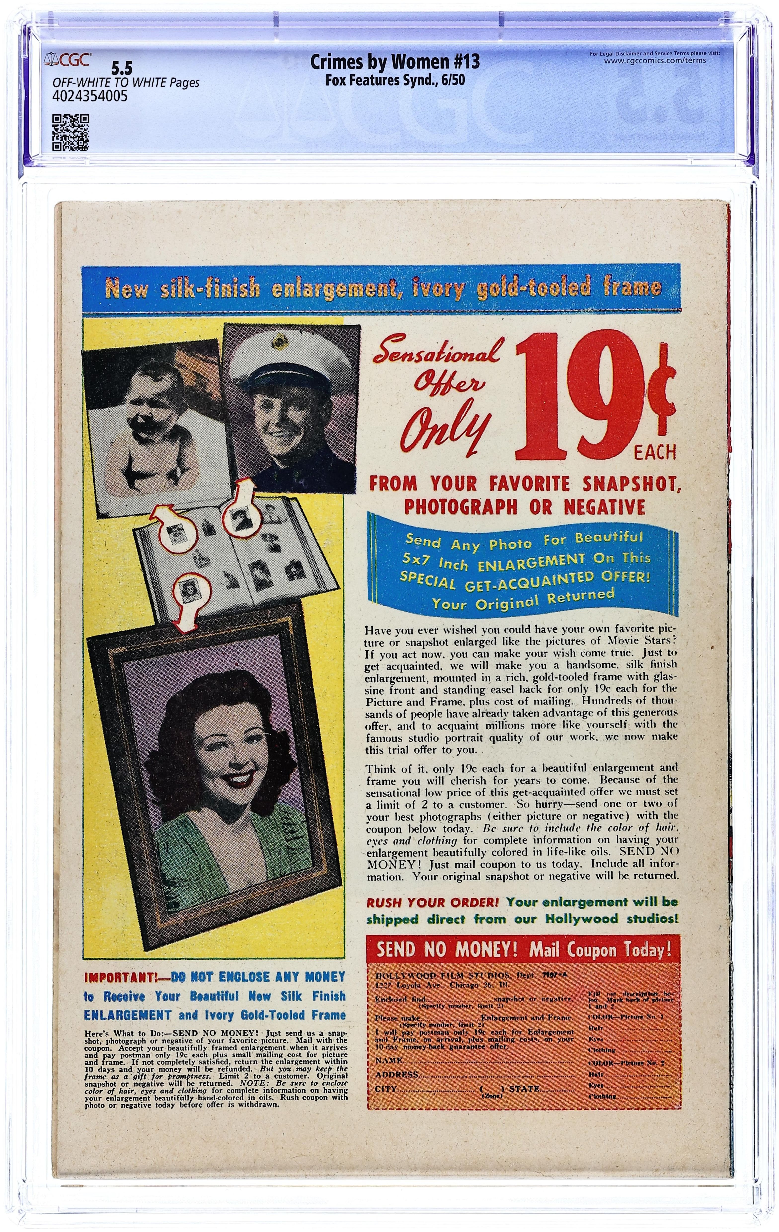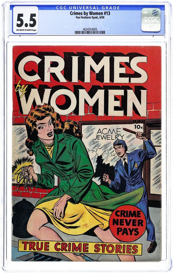 Fox Feature Syndicate creates a pre-Code title guaranteed to provide lurid covers and art, as women both historical and fictional commit murder and other heinous acts. Doll maker Margot Haffner gets an unusual order from sinister Count Aorta, but he soon learns the hard way that she's the better criminal; Mary Read becomes one of the most famed female pirates of all time; In a truly offbeat story, redheaded hobo queen Mable Reine leads a tramp army on a rampage of robbery and looting against moneyed society. Margot Haffner: Passion for Dolls; Maude Bennet and Her Crusade Against the Law; Mary Read, Woman Pirate; Mable Reine, Queen of the Jungle. 32 pages, Full Color. In order of appearance: "Margot Haffner, Passion for Dolls"; "Maude Bennet and Her Crusade Against the Law"; and "Mable Reine, Queen of the Jungle" reprinted in Vixens, Vamps and Vipers SC (2014 EA Press) Lost Villainesses of Golden Age Comics #1-1ST. "Mary Read, Woman Pirate, A True Action Crime Story" text story reprinted from Crimes by Women (1948) #7. Cover price $0.10. Grade: CGC 5.5 explanation of grade Condition: Used (collectible)