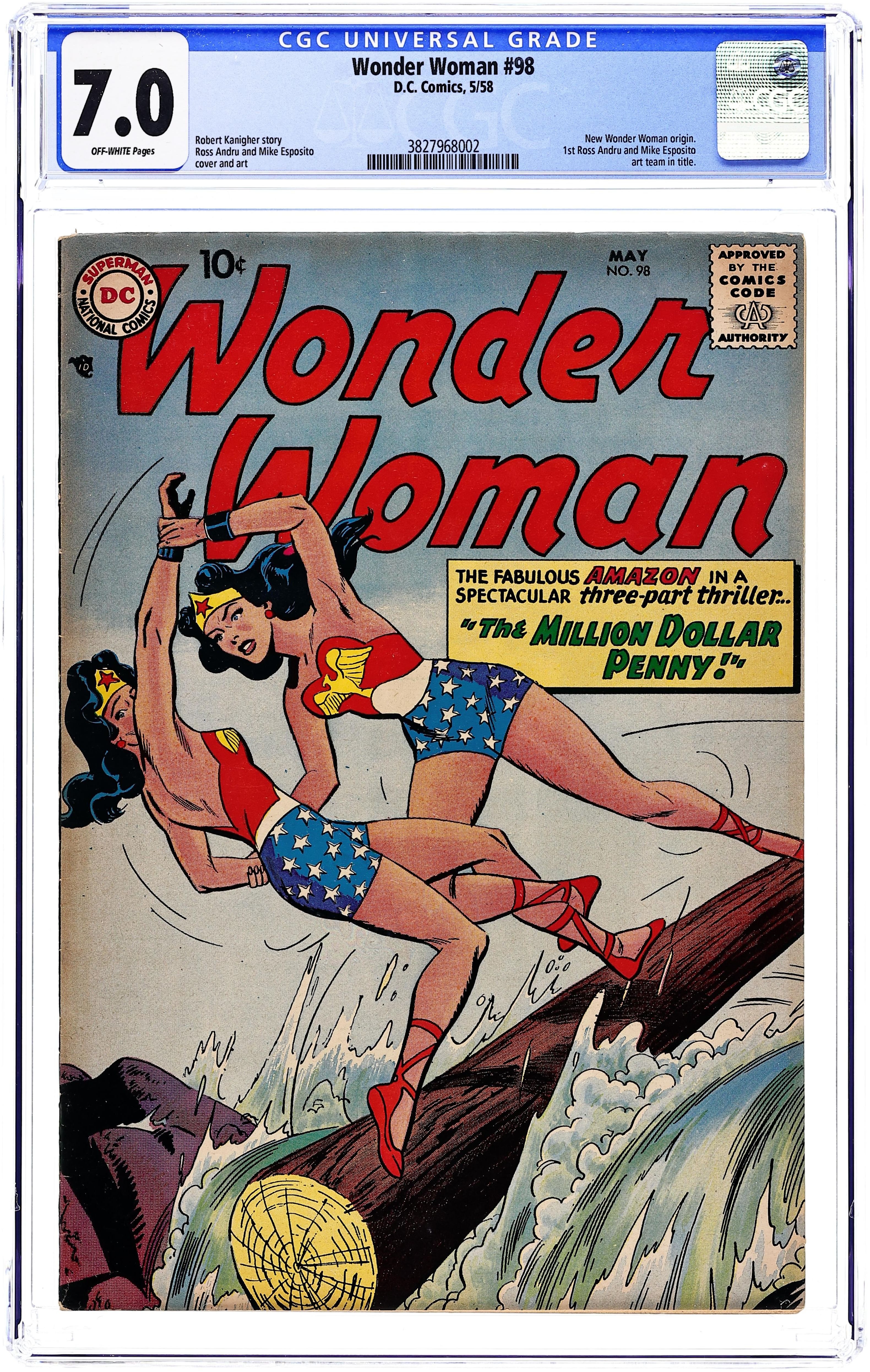 Cover pencils by Ross Andru, inks by Mike Esposito. "The Million Dollar Penny: Ch. 1: The Secret Amazon Trials," script by Robert Kanigher, pencils by Ross Andru, inks by Mike Esposito; Athena asks Hippolyta to choose a champion from the Amazons to go to Man's World and fight crime and injustice. "The Million Dollar Penny: Ch. 2: The Undersea Menace," script by Robert Kanigher, pencils by Ross Andru, inks by Mike Esposito; Steve Trevor crashes his plane over Paradise Island and is rescued by Princess Diana. Peg humor page by Henry Boltinoff. "The Million Dollar Penny: Ch. 3: The Impossible Bridge," script by Robert Kanigher, pencils by Ross Andru, inks by Mike Esposito; Wonder Woman has to turn a penny into a million dollars in 24 hours. 36 pages, Full Color. Cover price $0.10. Grade: CGC 7.0 explanation of grade Condition: Used (collectible)