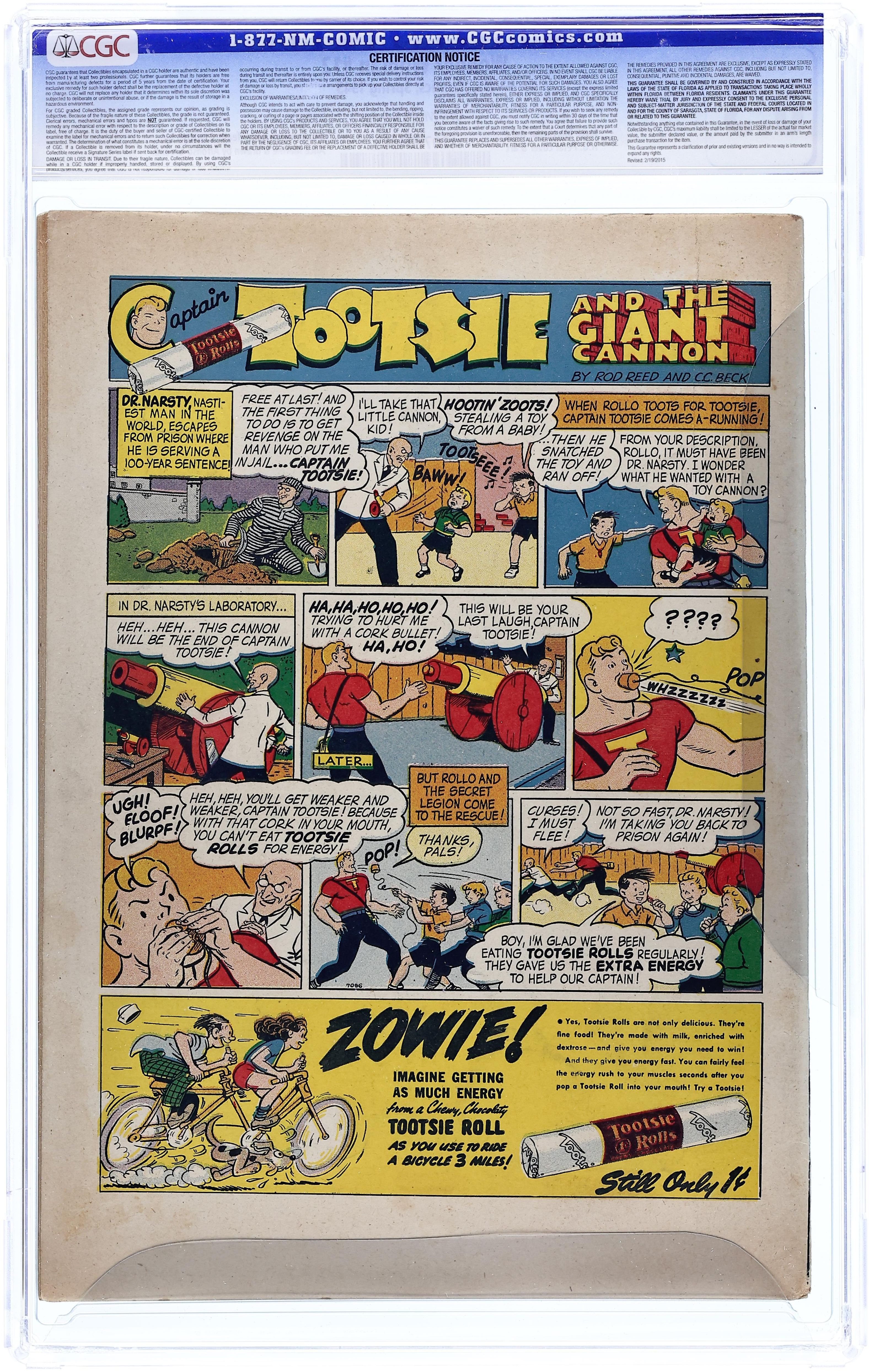 Cover by Harry G. Peter. Untitled story, script by Joye Hummel (as Charles Moulton), art by Harry G. Peter; Wonder Woman is given the gift of magnetic hearing by Desira, Queen of Venus, and learns that a 3rd World War is being planned. "The Ordeal of Fire," script by Joye Hummel (as Charles Moulton), art by Harry G. Peter; Etta and the Holliday girls are initiating new members of their sorority when one is transported to Venus and Wonder Woman must follow her. Wonder Women of History: four-page Helen Keller bio, script by Alice Marble, art by Alfonso Greene . Two-page text story, "S.O.S. - Miami" by Lynne Lovelace. "The Conquest of Venus," script by Joye Hummel (as Charles Moulton), art by Harry G. Peter; Wonder Woman tries to convert Velma to the ways of love and peace, but Velma succeeds in contacting a noted gangster and his men, getting them to invade and hopefully conquer Venus. Back cover ad, "Captain Tootsie and the Giant Cannon" by Rod Reed and C.C. Beck. 52 Pages, Full Color. Cover price $0.10. Grade: CGC 6.5 explanation of grade Condition: Used (collectible)
