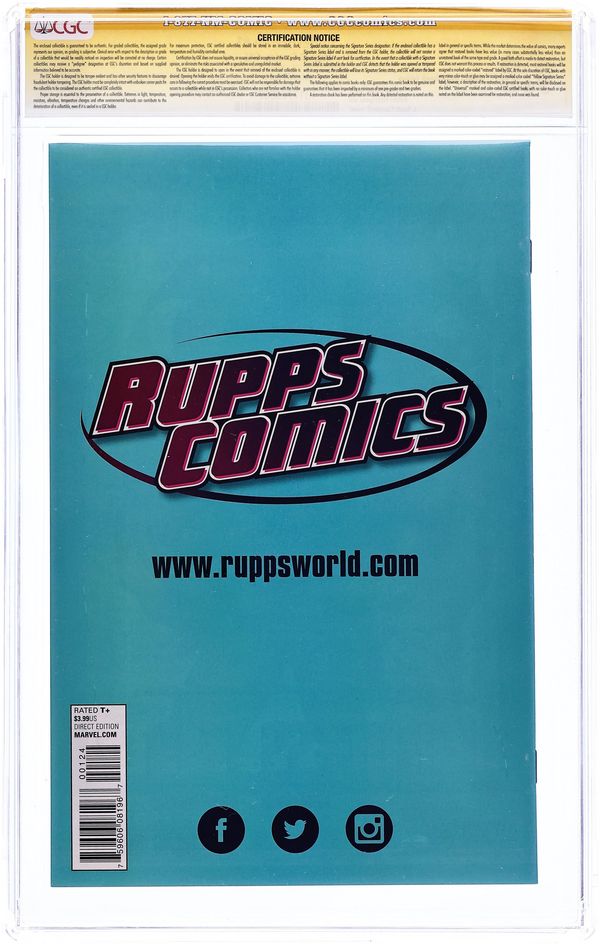 Starts Jan 3 Rupps Comics B&W Variant. Cover by J. Scott Cambpell. Written by Jason Latour. Art by Javier Rodriguez. SPIDER-GWEN SPINS INTO HER OWN SERIES! BECAUSE YOU DEMANDED IT! The breakout hit of the biggest Spider-Event of the century is taking comic shops by storm this winter with her own new ongoing series - SPIDER-GWEN! Gwen Stacy is Spider-Woman, but you knew that already. What you DON'T know is what friends and foes are waiting for her in the aftermath of Spider-Verse! 28 pages, full color. Rated T+ Grade: CGC 9.8 explanation of grade Condition: Used (collectible)