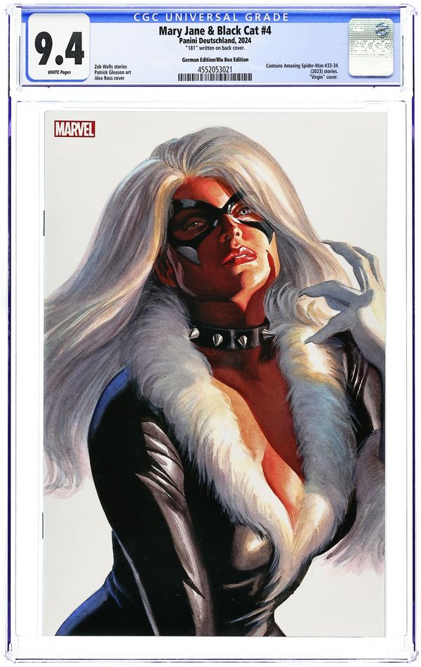 German Reprint Series. Blu Box Exclusive Variant Cover by Alex Ross - limited to 222 copies. Written by Zeb Wells. Art by Patrick Gleason. Reuses Cover from Mary Jane and Black Cat (2023 Marvel) 4B. Reprints Amazing Spider-Man (2022 7th Series) #33 and #34. German Language. Grade: CGC 9.4 explanation of grade Condition: Used (collectible) unless item is a new release