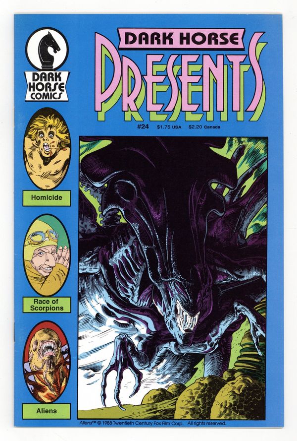 Cover by Mark A. Nelson. Writer Mark Verheiden and artist Mark A. Nelson present an all-new "side bar" story to Dark Horse's ongoing Aliens miniseries as they take us inside the mind of an Alien Queen! Plus-Just in time for Halloween, Kull writer John Arcudi and The American artist Grant Miehm team up on a tale of murder and...cannibalism in the wilds of New York. And Leopoldo Duranona continues his exciting five-part science fiction epic Race of Scorpions. 32 pages, B&W. Cover price $1.75. Grade: VF 8.0 explanation of grade Condition: Used (collectible)