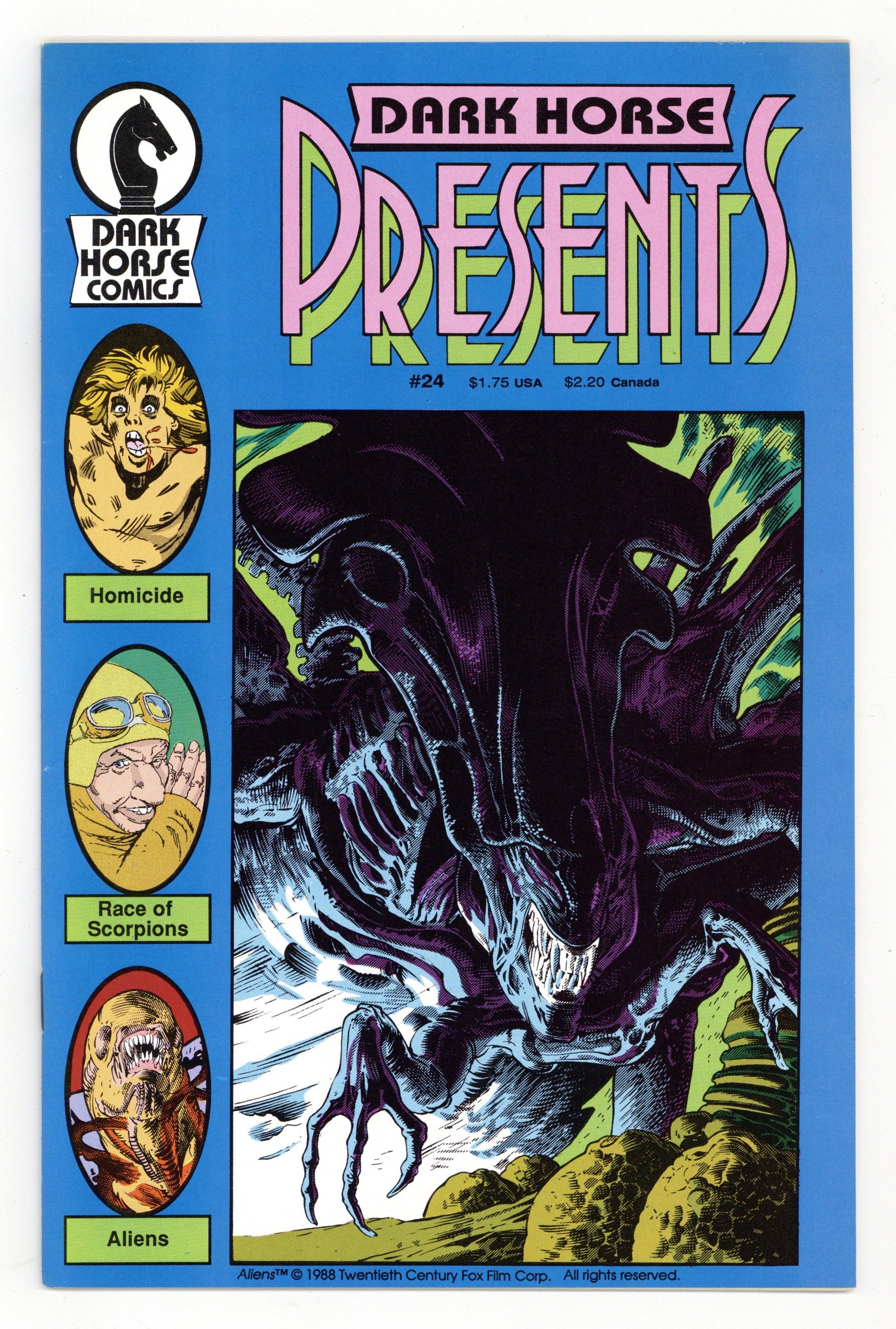 Cover by Mark A. Nelson. Writer Mark Verheiden and artist Mark A. Nelson present an all-new "side bar" story to Dark Horse's ongoing Aliens miniseries as they take us inside the mind of an Alien Queen! Plus-Just in time for Halloween, Kull writer John Arcudi and The American artist Grant Miehm team up on a tale of murder and...cannibalism in the wilds of New York. And Leopoldo Duranona continues his exciting five-part science fiction epic Race of Scorpions. 32 pages, B&W. Cover price $1.75. Grade: VF 8.0 explanation of grade Condition: Used (collectible)