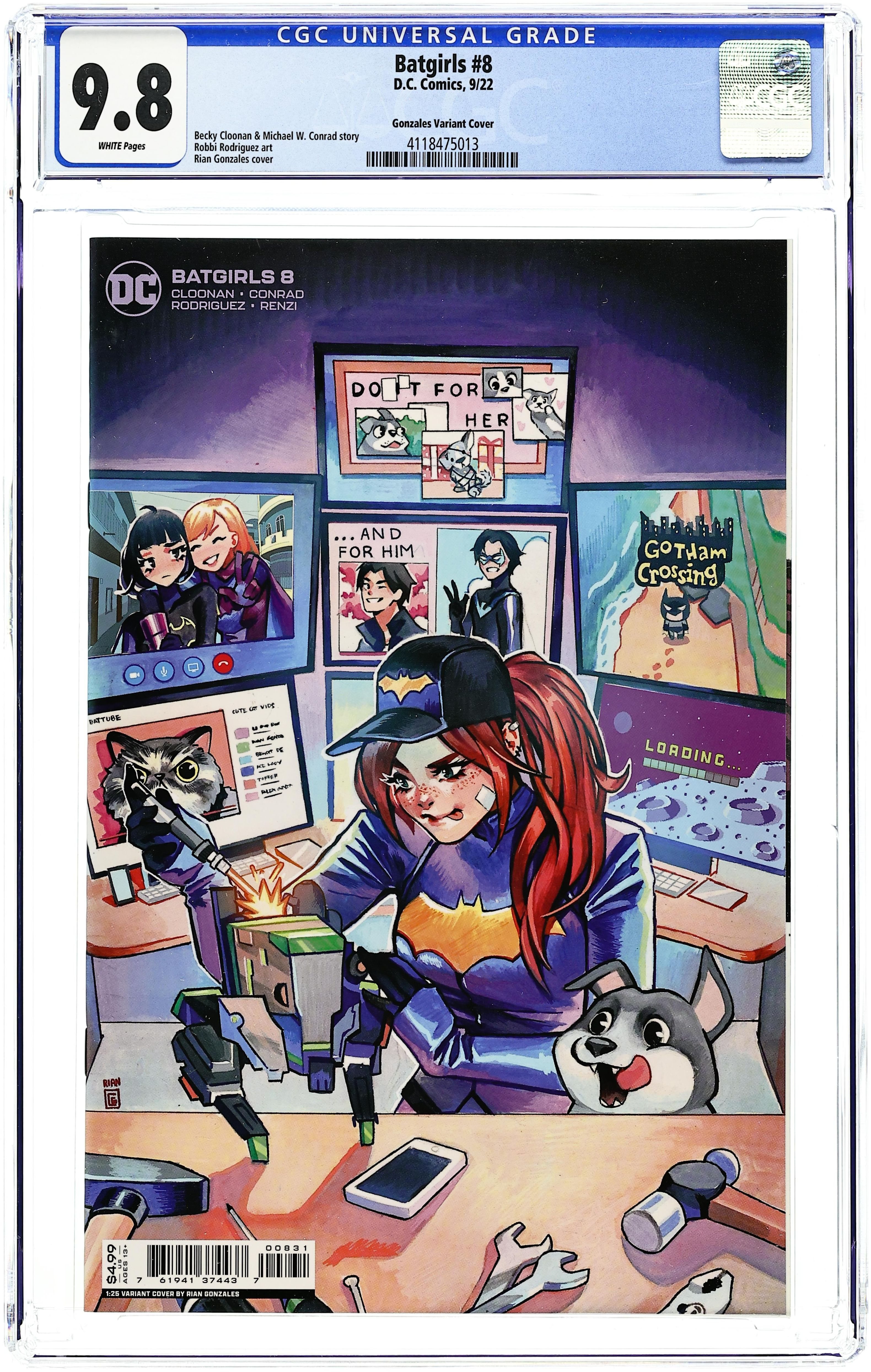 Starts Dec 8 Limited 1 for 25 Retailer Incentive Variant Cover. Written by Becky Cloonan, Michael W. Conrad. Art by Robbi Rodriguez. Cover by Rian Gonzales. The Batgirls break into the Iceberg Lounge in order to rescue Seer, whos held hostage by the Saints! Nightwing and Oracle get dressed up and go undercover to help the Batgirls, while also making the mission a date night! But why would they help Seer, the very person whos been hacking into their network and harassing them? Read here to find out! 32 pages, full color. Rated T+ Cover price $4.99. Grade: CGC 9.8 explanation of grade Condition: Used (collectible)