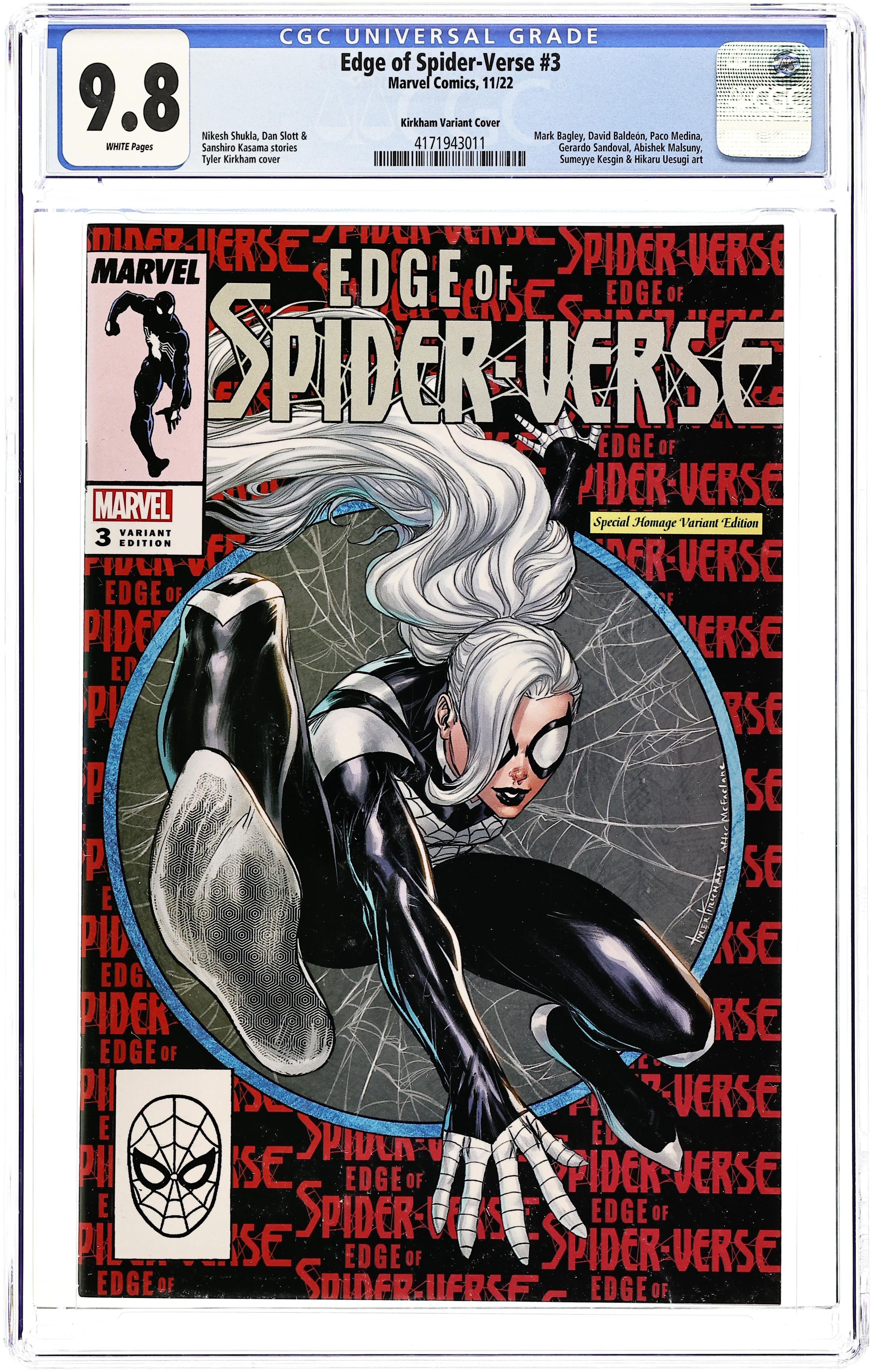 Comics Illuminati (Unknown Comics, Street Level Hero, Comic Traders, Frankies Comics, and The 616 Comics) exclusive Cover by Tyler Kirkham. Written by Dan Slott; Marvel Various. Art by Mark Bagley; Marvel Various. IN THIS ISSUE! SPIDER-MAN: INDIA! AND NIGHT-SPIDER! Wait, WHO IS NIGHT-SPIDER?! 36 pages, full color. RATED T+ Grade: CGC 9.8 explanation of grade Condition: Used (collectible)