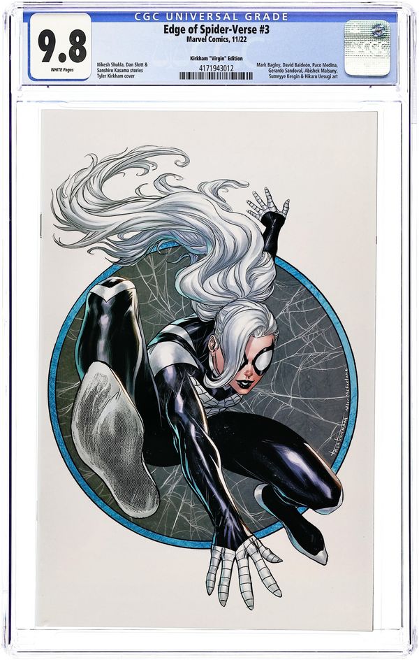 Comics Illuminati (Unknown Comics, Street Level Hero, Comic Traders, Frankies Comics, and The 616 Comics) exclusive Virgin Cover by Tyler Kirkham. Written by Dan Slott; Marvel Various. Art by Mark Bagley; Marvel Various. IN THIS ISSUE! SPIDER-MAN: INDIA! AND NIGHT-SPIDER! Wait, WHO IS NIGHT-SPIDER?! 36 pages, full color. RATED T+ Grade: CGC 9.8 explanation of grade Condition: Used (collectible)