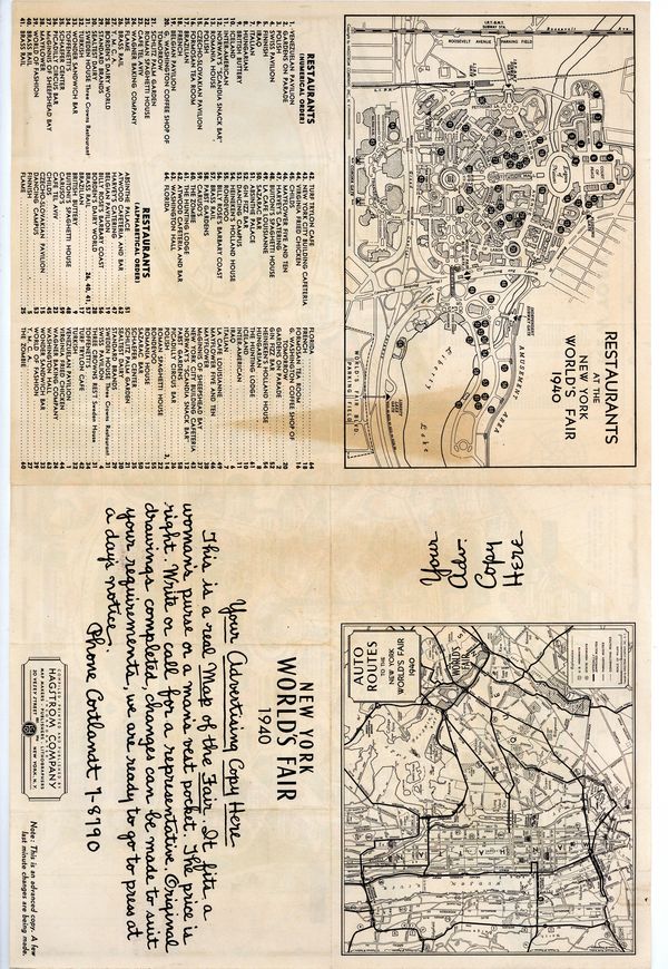 New York World's Fair Map (1940 Hagstrom Company, Inc.). Advance copy for potential advertisers. 16.5" x 11", single sheet, full color. Multiple full length creases with some discoloring to rear.