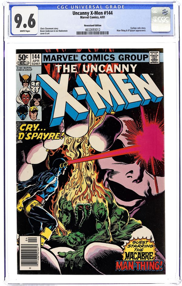 Newsstand Edition. "Even in Death!" Guest-starring the Man-Thing. Story by Chris Claremont. Art by Brent Anderson and Joe Rubinstein. Cyclops faces his fears in this macabre tale featuring the Man-Thing and the sinister D'Spayre. 36 pgs. Cover price $0.50. Grade: CGC 9.6 explanation of grade Condition: Used (collectible)