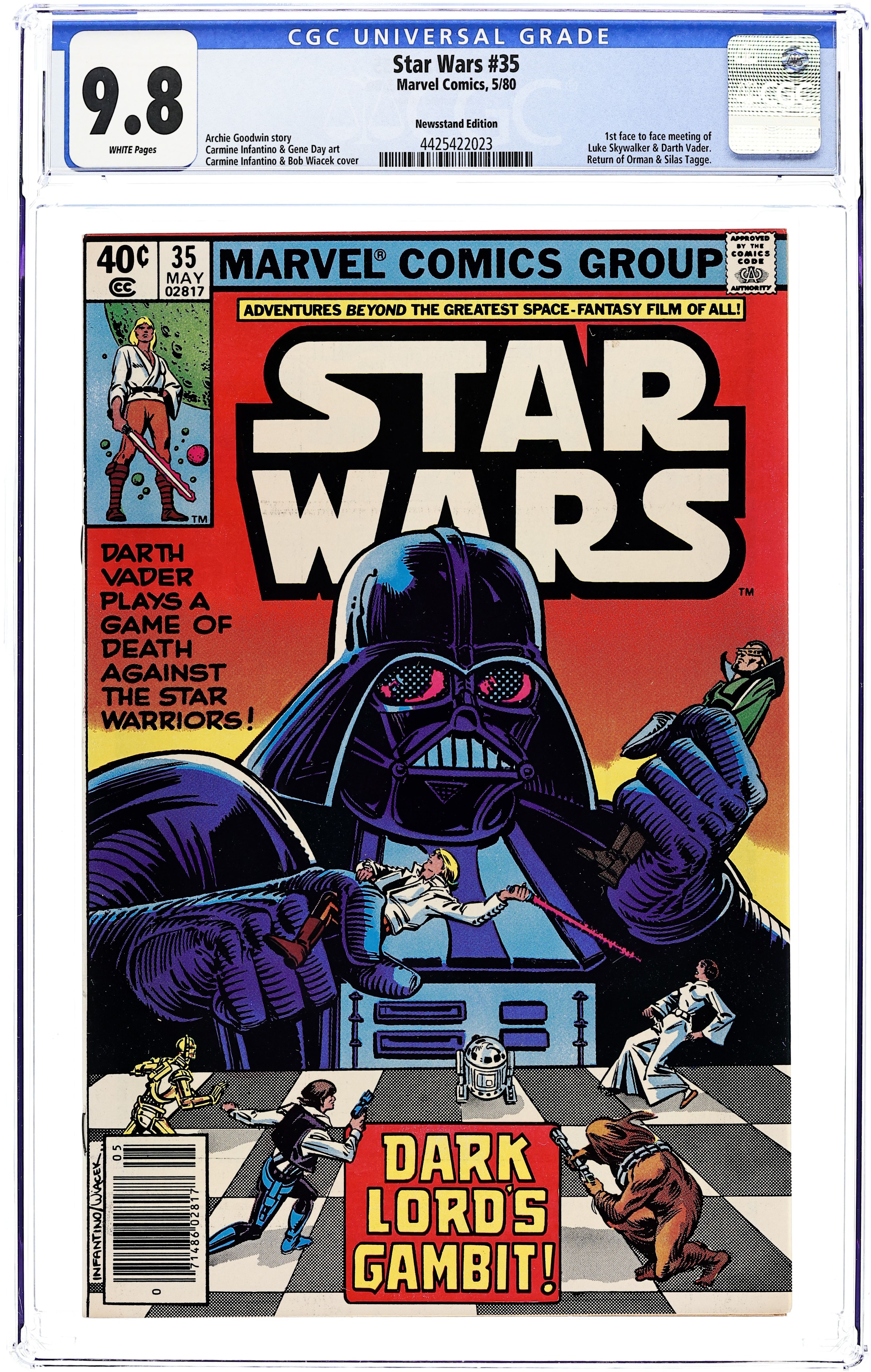 Newsstand Edition. "Dark Lord's Gambit!" Written by Archie Goodwin. Art by Carmine Infantino and Gene Day. Like pieces on the game board, the dark lord, Darth Vader, maneuvers the players into position for the coup de tat. The galaxy has just become a more dangerous place to be for the young Luke Skywalker, for the Sith Lord now knows the name of the man who thwarted him by destroying the Death Star. Cover price $0.40. Grade: CGC 9.8 explanation of grade Condition: Used (collectible)