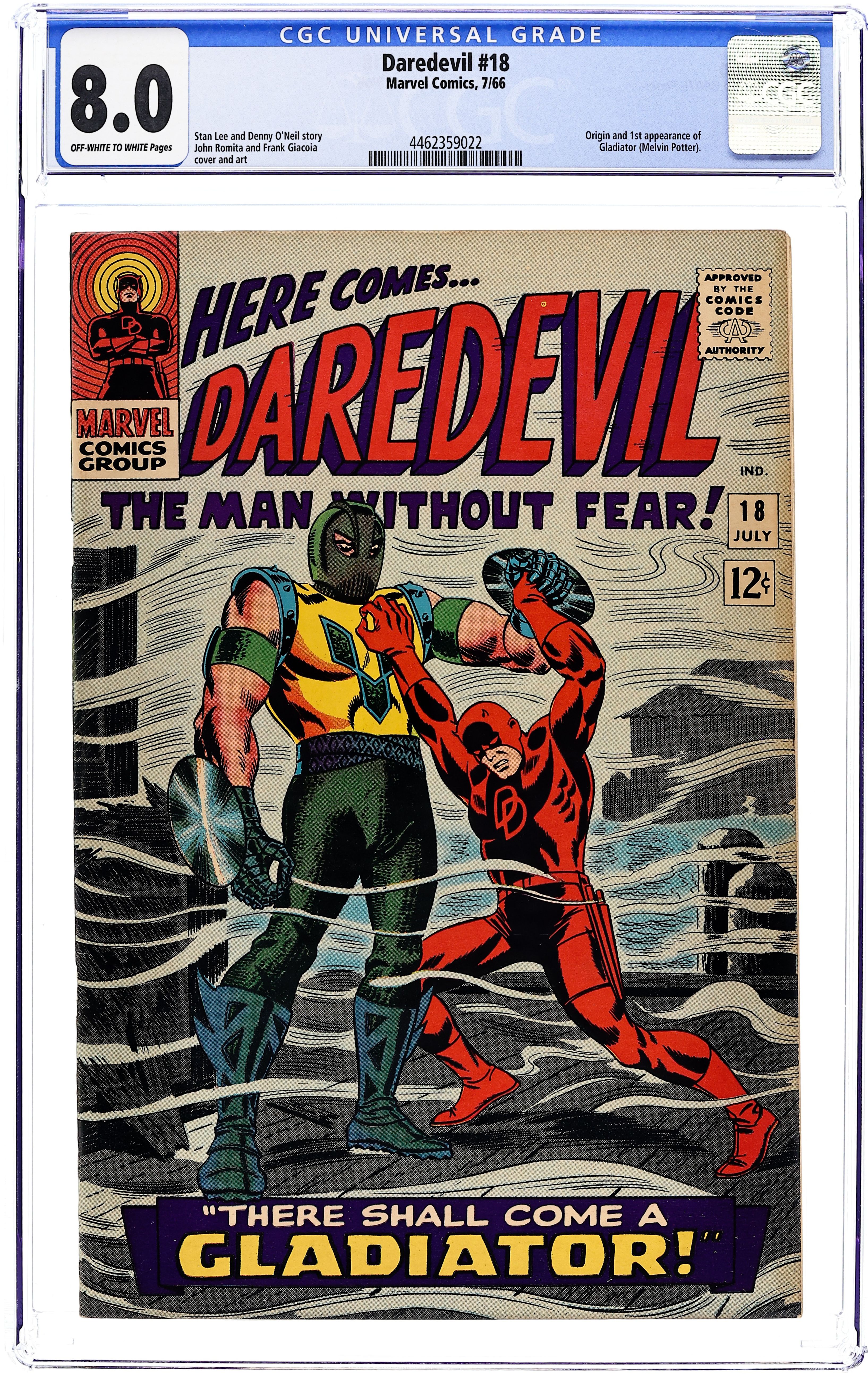 Cover pencils by John Romita, inks by Frank Giacoia. First appearance of the Gladiator in There Shall Come a Gladiator!, plot by Stan Lee, script by Lee (pages 1-7) and Dennis O'Neil (pages 8-20), pencils by John Romita Sr., inks by Frank Giacoia; A burly costume store owner decides it is really the clothes that make the man and begins his career as the Gladiator; Foggy gets a Daredevil costume from Melvin who talks the tubby lawyer into setting up a staged super fight to impress Karen; Thinking his fight with Foggy will draw out the real DD, Gladiator goes after him for real and Matt has to take a hand in rescuing his friend; In the night and the fog, everyone assumes it is Foggy as Daredevil that beat the Gladiator back; cameos by Thor, Dr. Strange, Captain America, and Dr. Doom (as costumes in the Gladiator's costume shop). 36 pgs. Cover price $0.12. Cover price $0.12. Grade: CGC 8.0 explanation of grade Condition: Used (collectible)