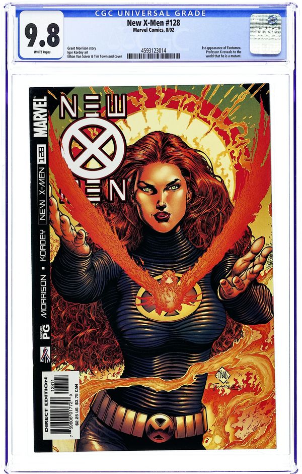 Direct Edition. Written by Grant Morrison. Art by Igor Kordey. Cover by Ethan Van Sciver & Tim Townsend. It's NEW X-MEN action -- twice this month! THE STORY: In a search for clues about her growing telekinetic strength, Professor X and Jean Grey jet off to Paris to probe the boundaries of Marvel Girl's Phoenix Force! Meanwhile, back at the Institute, while the cat is away, Emma Frost makes her big move on Cyclops! Featuring the first appearance of Fantomex. Cover price $2.25. Grade: CGC 9.8 explanation of grade Condition: Used (collectible)